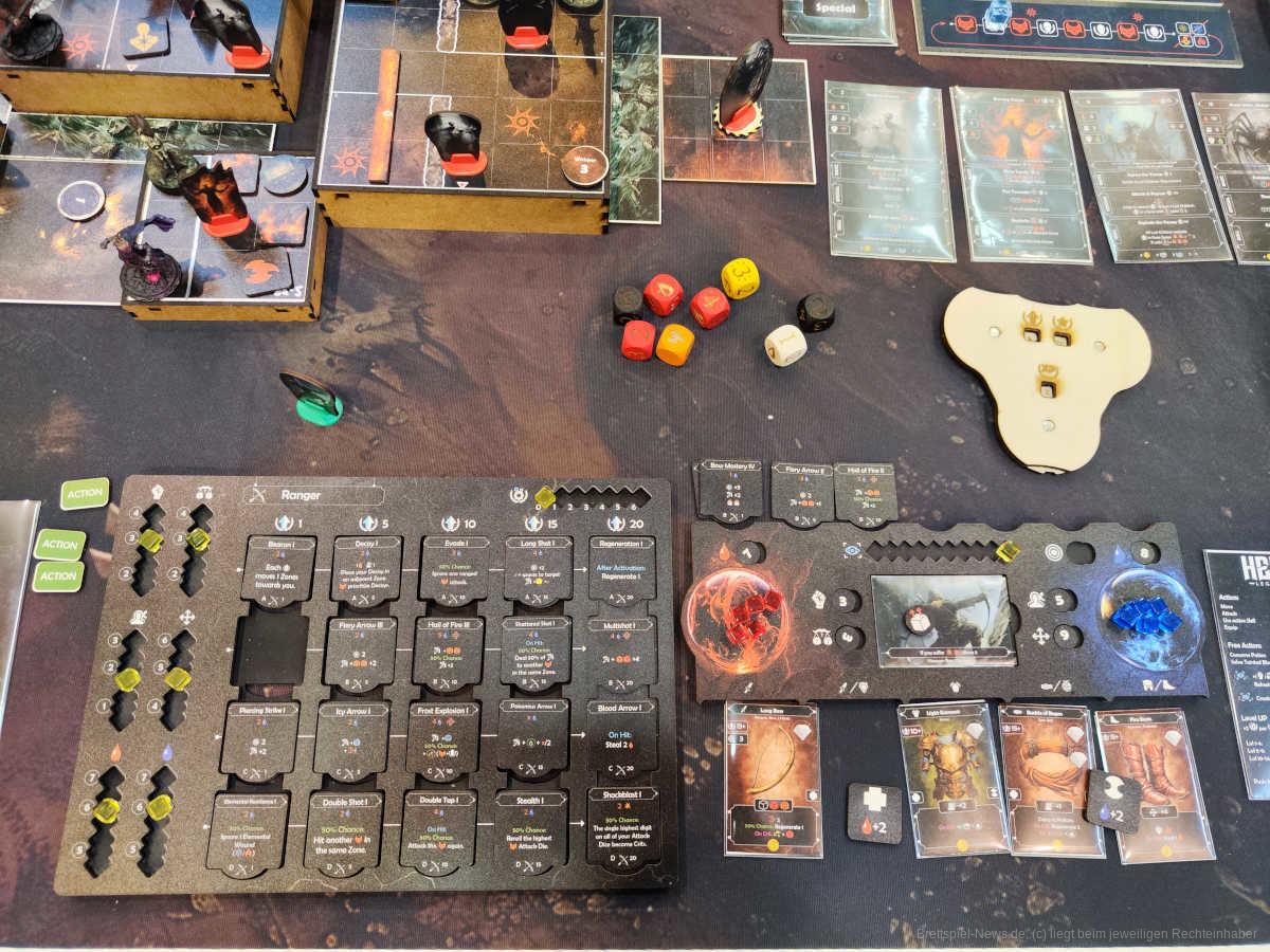 Als erstes fällt natürlich das Spielfeld mit den unterschiedlich hohen Ebenen ins Auge. Man möchte direkt wissen was für spielerische Auswirkungen das im Spiel hat. Direkt danach fällt der Blick sofort auf das Charaktertableau, welches äußerst üppig ausfällt und direkt an Diablo erinnert. Man bekommt direkt Lust verschieden Skillungen der unterschiedlichen Charaktere auszuprobieren, von den es im späteren Spiel zwischen 6 und 10 unterschiedliche geben soll. Auch das Synergiesystem der Itemkarten verspricht eine kleine Lootorgie.