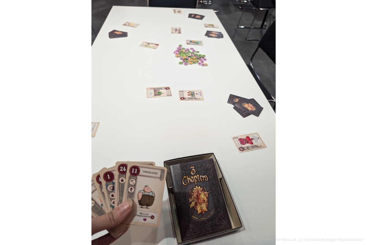 Schon vor der Messe wurde in vielen Blogs und Kanälen von diesem neuen AMIGO-Titel berichtet. Bereits nach Tag 1 der Messe waren 75% des Kontingents abverkauft, so dass für Samstag Nachschub geordert werden musste. Wir konnten uns „3 Chapters“ auf der SPIEL 24 ansehen.