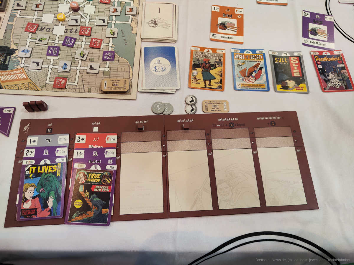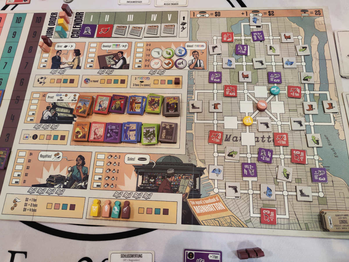 Die Farbgebung des Spielbretts und des Materials wirkt auf den ersten Blick einmal sehr karg und langweilig. In Verbindung mit den Covern der einzelnen Comics und vor dem Hintergrund der damaligen Zeit, passt es aber optimal zu dem Spiel und untermahlt den Charm dieses sehr gut. Die einzelnen Aktionen sind überschaubar und thematisch sehr gut nachvollziehbar. Es ergibt einfach Sinn, das man für ein Comic erst einmal einen Schreiber für die Geschichte, einen Künstler für die Bilder, sowie Ideen und ein Cover braucht. Schön ist auch der Gedanke, ob man sich eher auf qualitativ hochwertige Ware/Comics konzentriert, oder die Quantität vor der Qualität bei einem steht. Man kann sogar beim Konkurrenten abkupfern und (schlechte) Kopien seiner Comics herausbringen, um auf der Welle des Erfolgs mitzureiten.