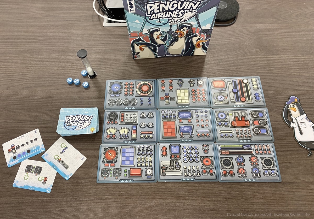 „Penguin Airlines“ ist eine Lokalisierung vom spanischen Verlag „Perro Loko Games“, welches dort bereits 2023 erschien. In diesem Spiel treten Zweierteams unter Zeitdruck gegeneinander an. Einer der Teamkollegen sitzt im Tower und erhält eine Karte mit Anweisungen auf die Hand. Der andere sitzt auf dem Pilotensitz und muss die richtigen Schalter und Knöpfe im modularen Cockpit drücken. Nur leider gibt es unzählige davon, die alle sehr ähnlich aussehen.