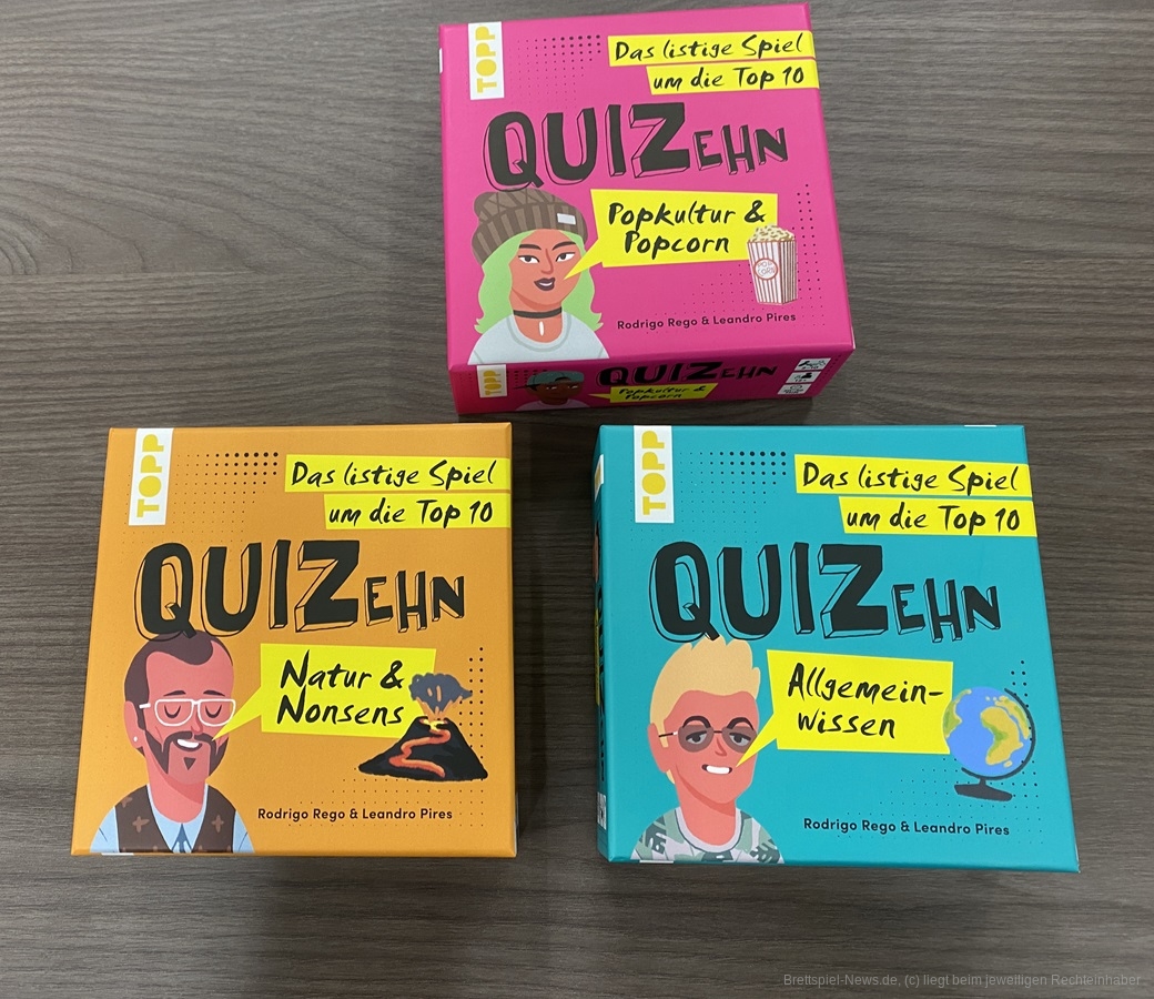 Die letzte Neuheit, die mir vorgestellt wurde, ist eine kleine Reihe, bestehend aus drei Boxen, welche den Quizbereich abdecken. „QUIZehn“ ist vielleicht etwas schwer auszusprechen, der Titel trifft das Spielprinzip aber auf den Punkt. Den Teilnehmern wird reihum eine gemeinsame Frage gestellt, deren Antwort hoffentlich in der Top-10-Liste auf der Kartenrückseite abgebildet ist. Wer eine falsche Antwort gibt, scheidet nicht unbedingt aus dem Spiel aus. Erst wenn ein Ratender einen anderen anzweifelt, wird dessen Antwort überprüft. Wer dann falsch lag, verliert einen Lebenspunkt.