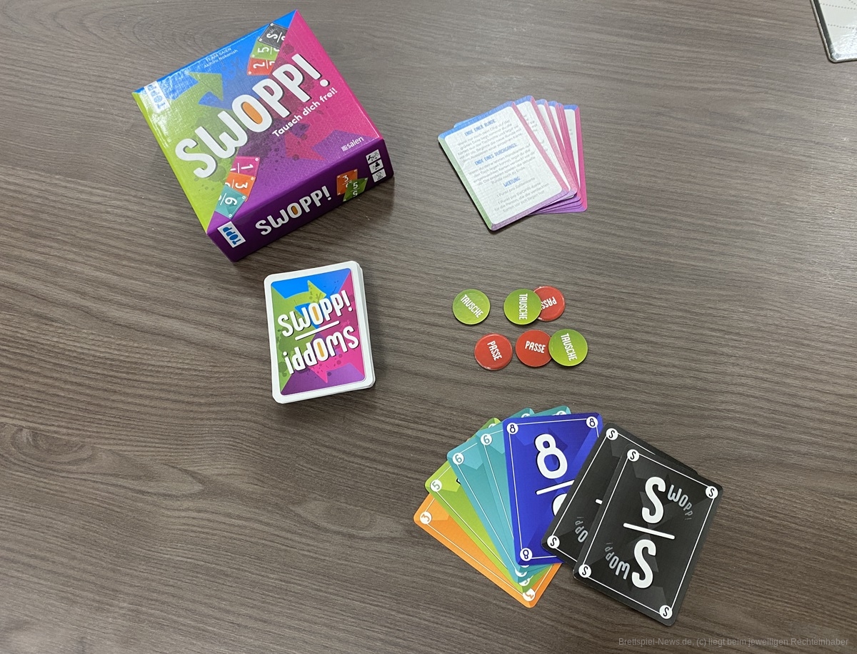 „Swopp!“ ist ein Kartenspiel aus Japan. Ziel des Spiels ist es, alle eigenen Handkarten loszuwerden. Wer einen ‚Stich‘ gewinnt, muss allerdings alle geschlagenen Karten auf die Hand nehmen. Wer es schafft, alle Handkarten loszuwerden, kann Punkten und damit das Spiel gewinnen.