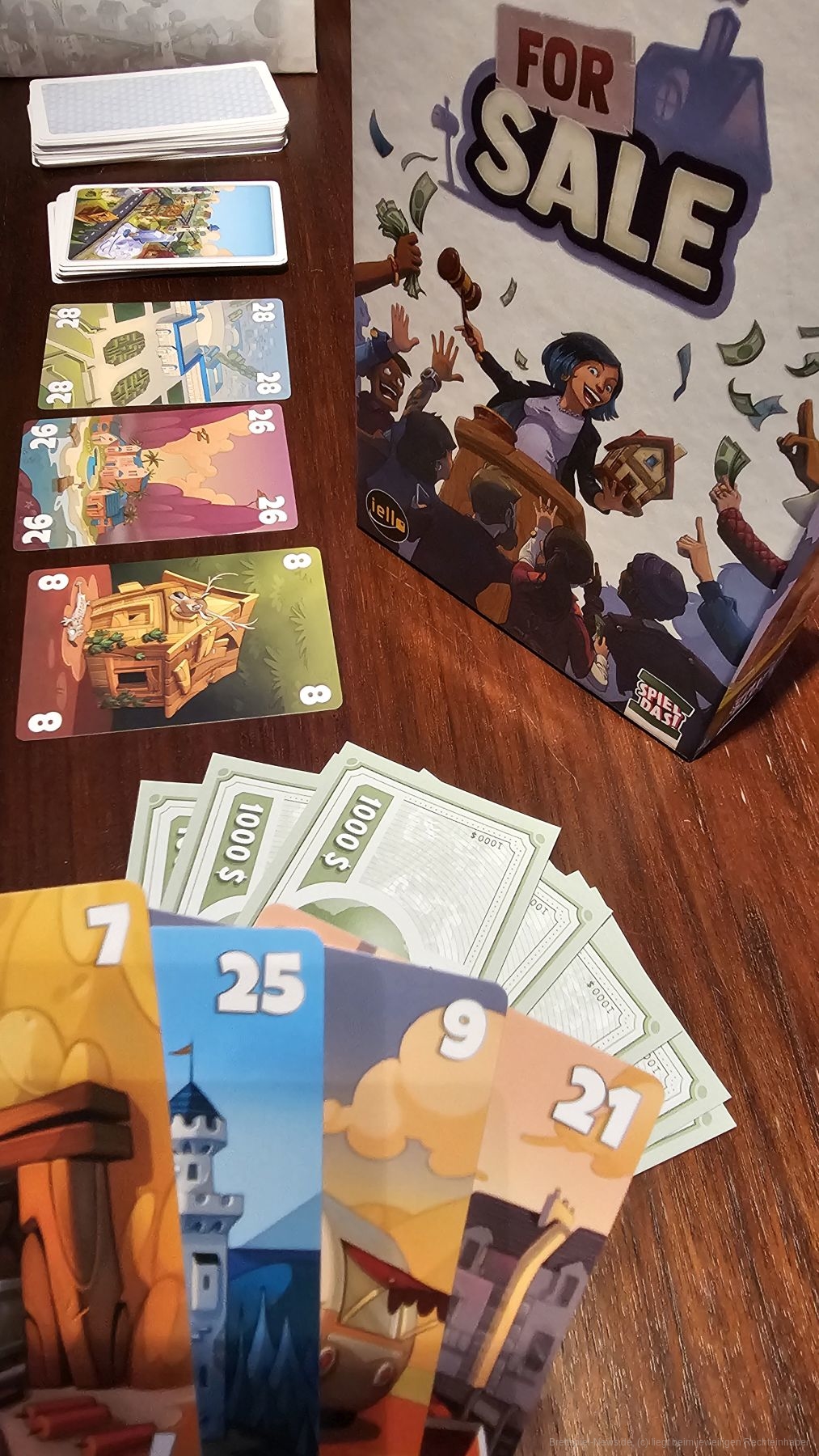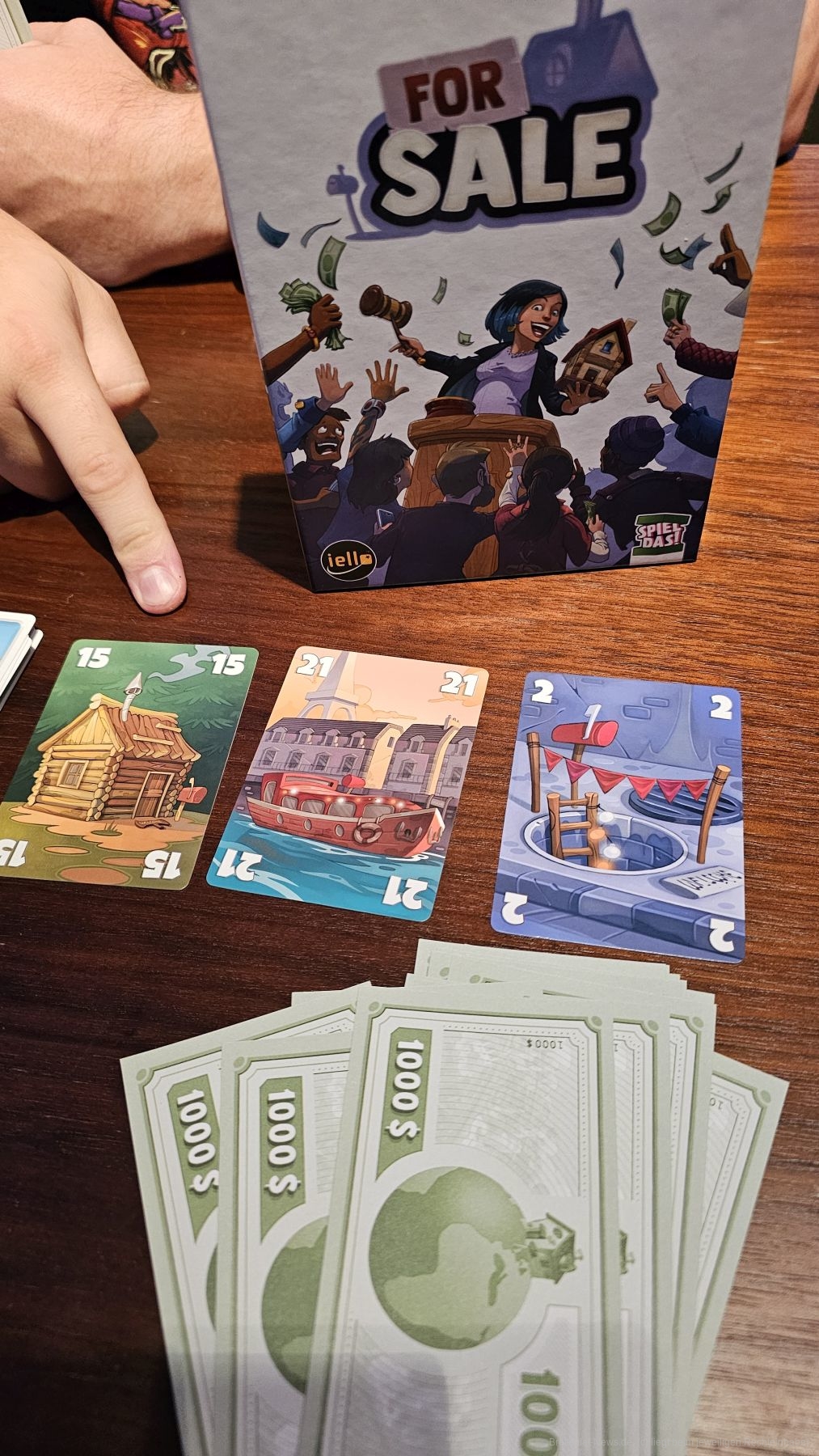 "For Sale" ist ein Auktionsspiel mit einfachen Regeln, in dem wir versuchen möglichst günstig Immobilien kaufen, um sie dann später für horrende Summen weiter zu verkaufen.