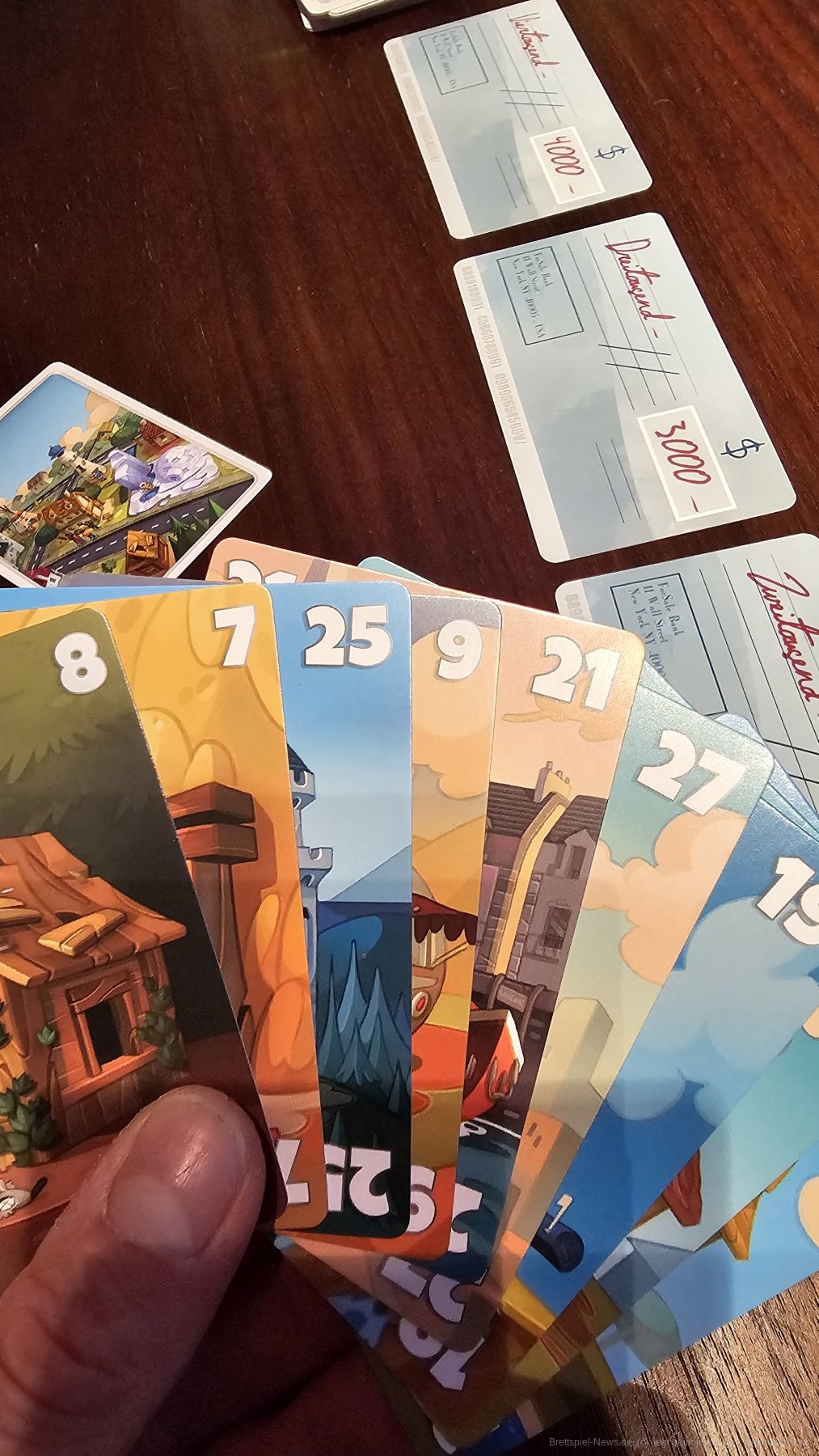 In der 2. Phase legen wir dann unserere ersteigerten Häuser, welche einen Wert zwischen 1 und 30 haben, verdeckt als Gebot für Schecks ab. Auch hier ist taktieren gefragt, denn vielleicht bekommen wir unsere Bruchbuden später für horrende Summen verkauft.