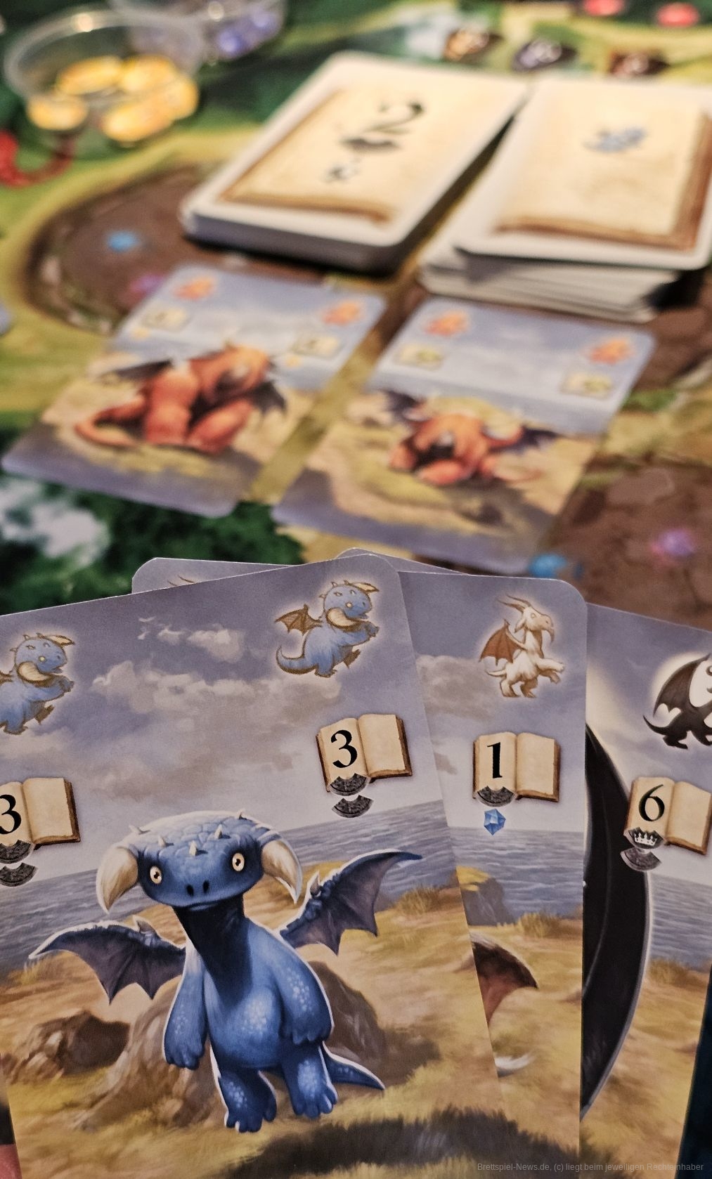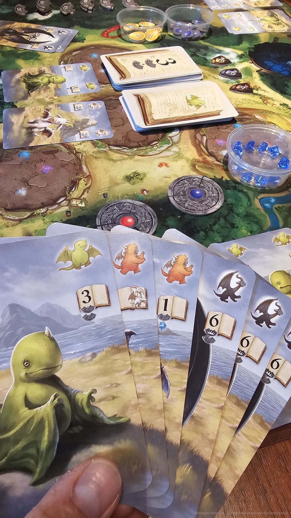 Nach dem Ziehen dürfen wir Drachen vor uns ausspielen um die aktuell angegebene Belohnung zu erhalten. Dafür müssen wir aber genau die vom Buch geforderte Anzahl Drachen, der angegebenen Farbe auf der Hand haben. Wenn wir das nicht haben, dürfen wir Karten aus der Hand, zurück auf das Buch legen, um es zu unseren Gunsten zu manipulieren. Somit sind wir nicht komplett dem Glück überlassen, können es aber gehörig strapazieren.