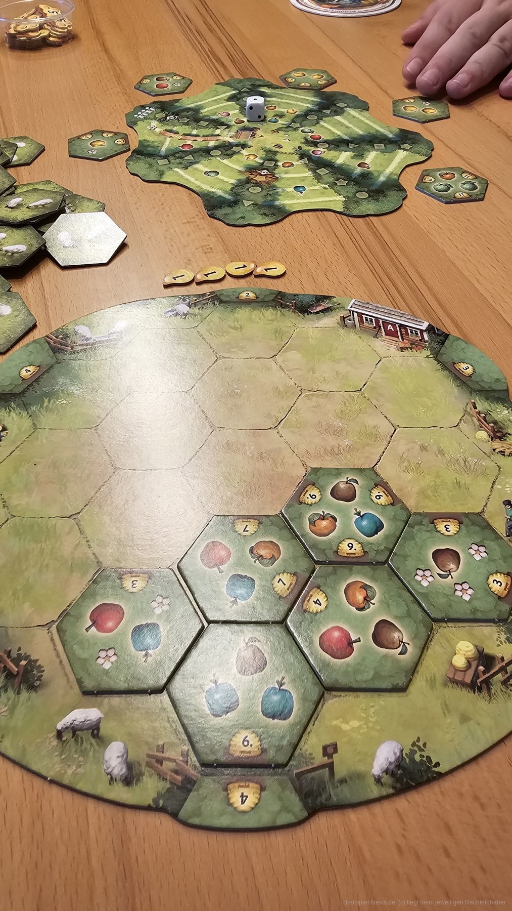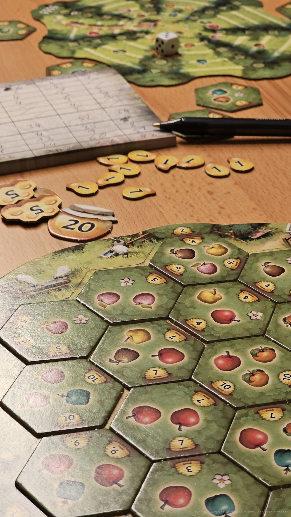 So versuchen wir in erster Linie große Gruppen zu bilden und sollten aber auch versuchen, bis zum Spielende alle Apfelsorten in die Wertung zu bringen, da dies viele Bonuspunkte gibt. Auch zwischen unseren Zügen können Apfelwertungen ausgelöst werden, die uns wertvollen Honig bringen.