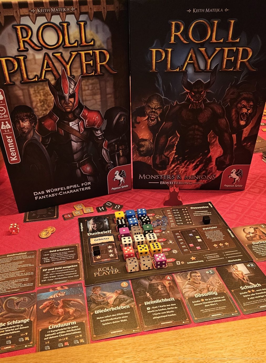 "Roll Player" ist ein Würfel-Einsetz- und Manipulations-Spiel für 1-4 Personen (mit Erweiterung bis 5) ab 12 Jahren, mit einer Spielzeit von 60-120 Minuten, in dem wir wie in einem Rollenspiel unseren Charakter mit all seinen Fähigkeiten erschaffen und auch gegen Monster kämpfen, wenn die Erweiterung eingebunden ist.