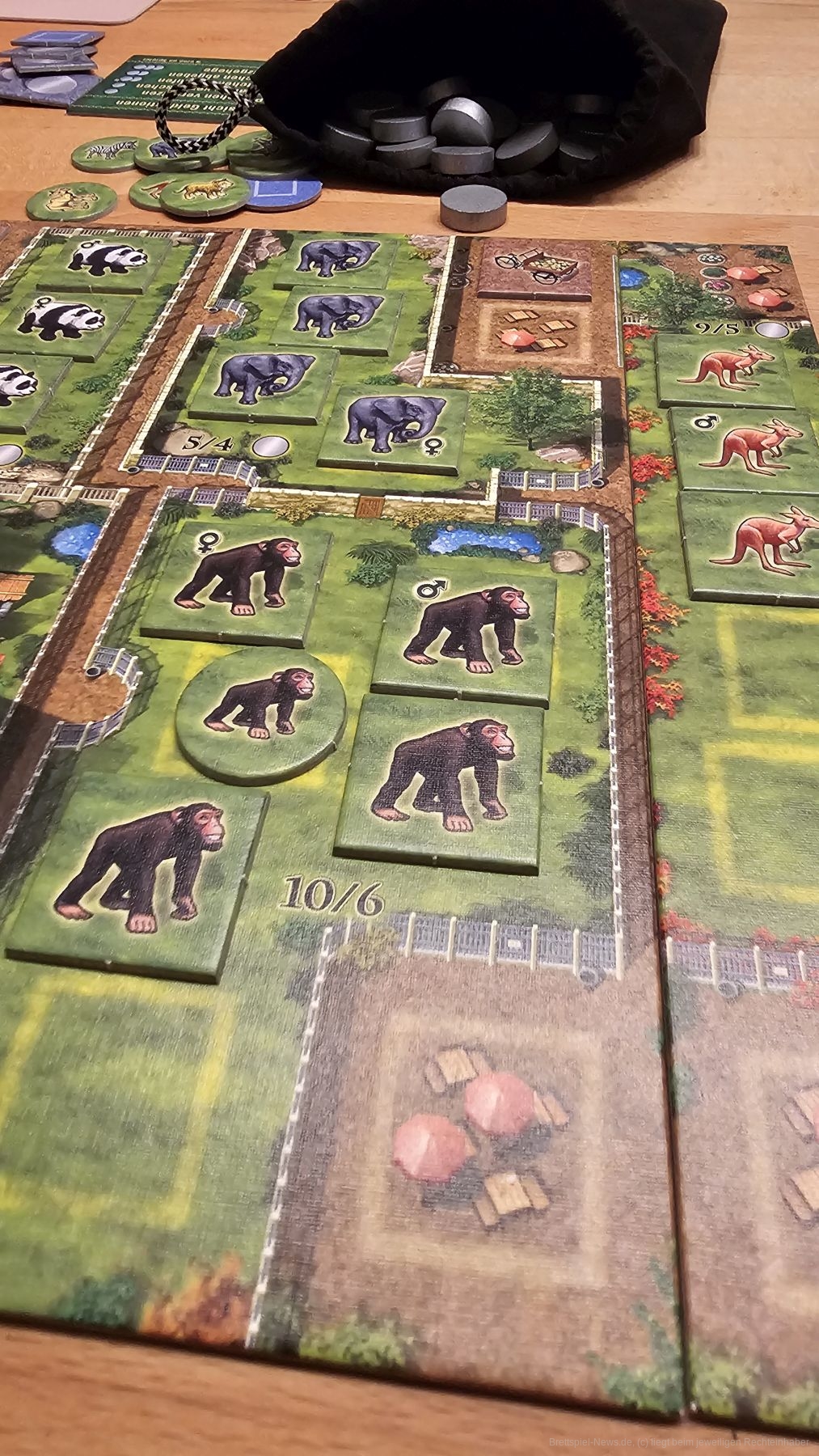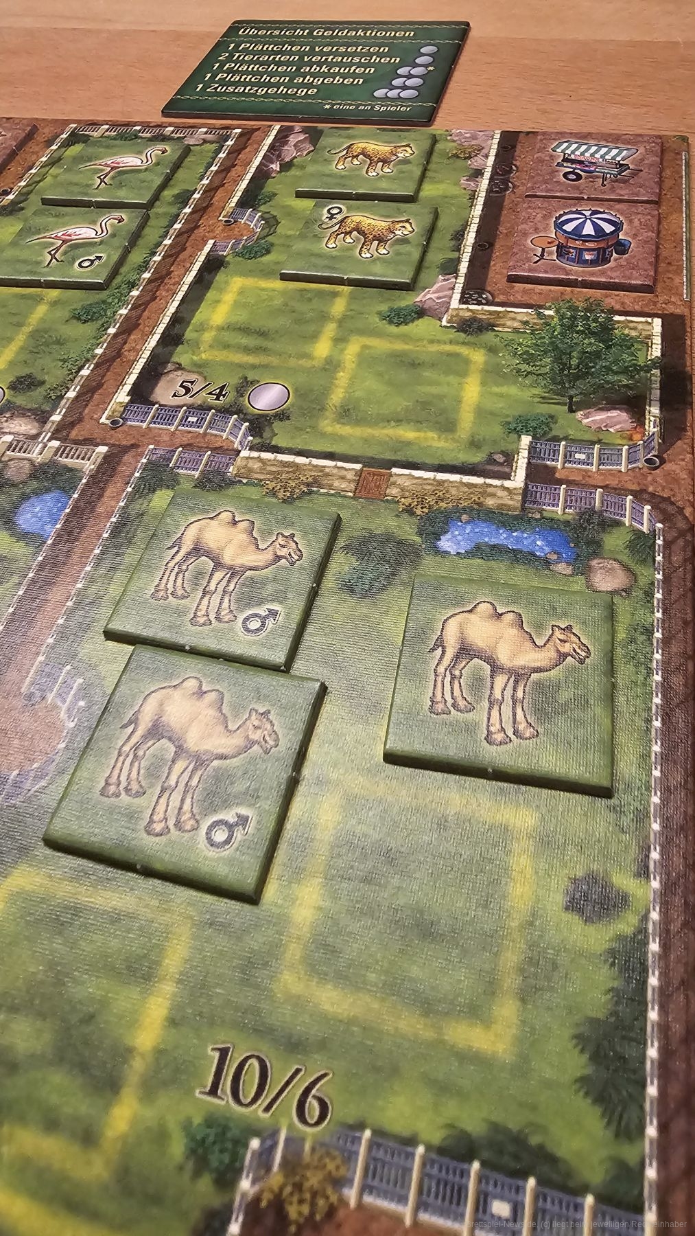 Nehmen wir einen Wagen, müssen wir alle darauf liegenden Plättchen nehmen und in unseren Zoo einsetzten. Es gibt männliche und weibliche Tiere. Bringen wir die Tiere beider Geschlechter in einem Gehege zusammen, dürfen wir zusätzlich ein Tierbaby in unser Gehege legen. In den Gehegen dürfen nur Tiere einer Art liegen. Die Gehege bringen am Ende nur Siegpunkte, wenn sie gefüllt sind. Zudem erhalten wir bei manchen Gehegen einen einmaligen Sofort-Bonus, wenn wir sie komplett füllen.