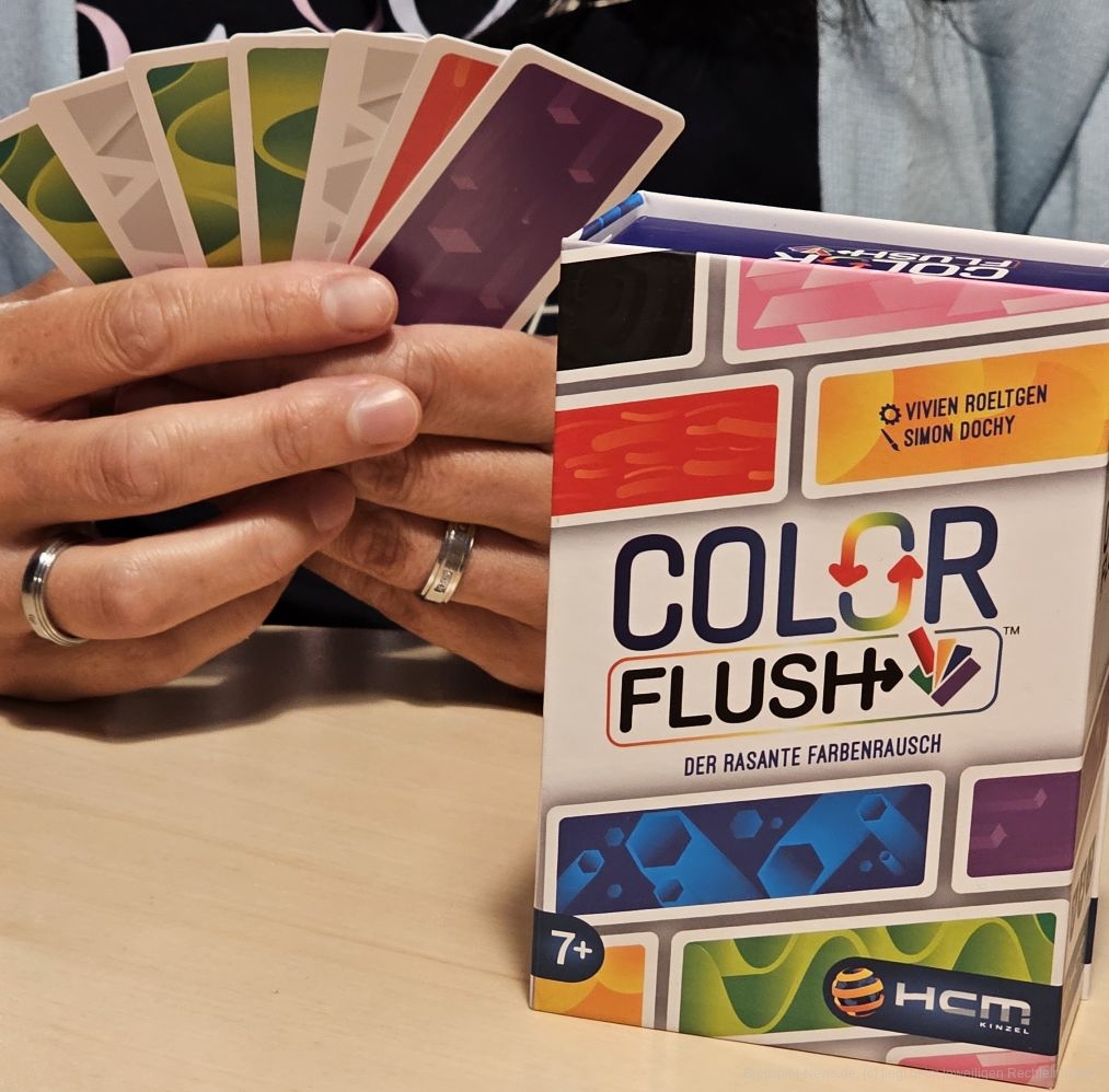 "Color Flush" ist ein schnelles, sehr einfaches Set-Collection-Kartenspiel für 3-6 Personen ab 7 Jahren mit einer Spielzeit von etwa 20 Minuten, in dem wir versuchen, nur Karten einer einzigen, zu uns gewandten Farbe auf der Hand zu haben.