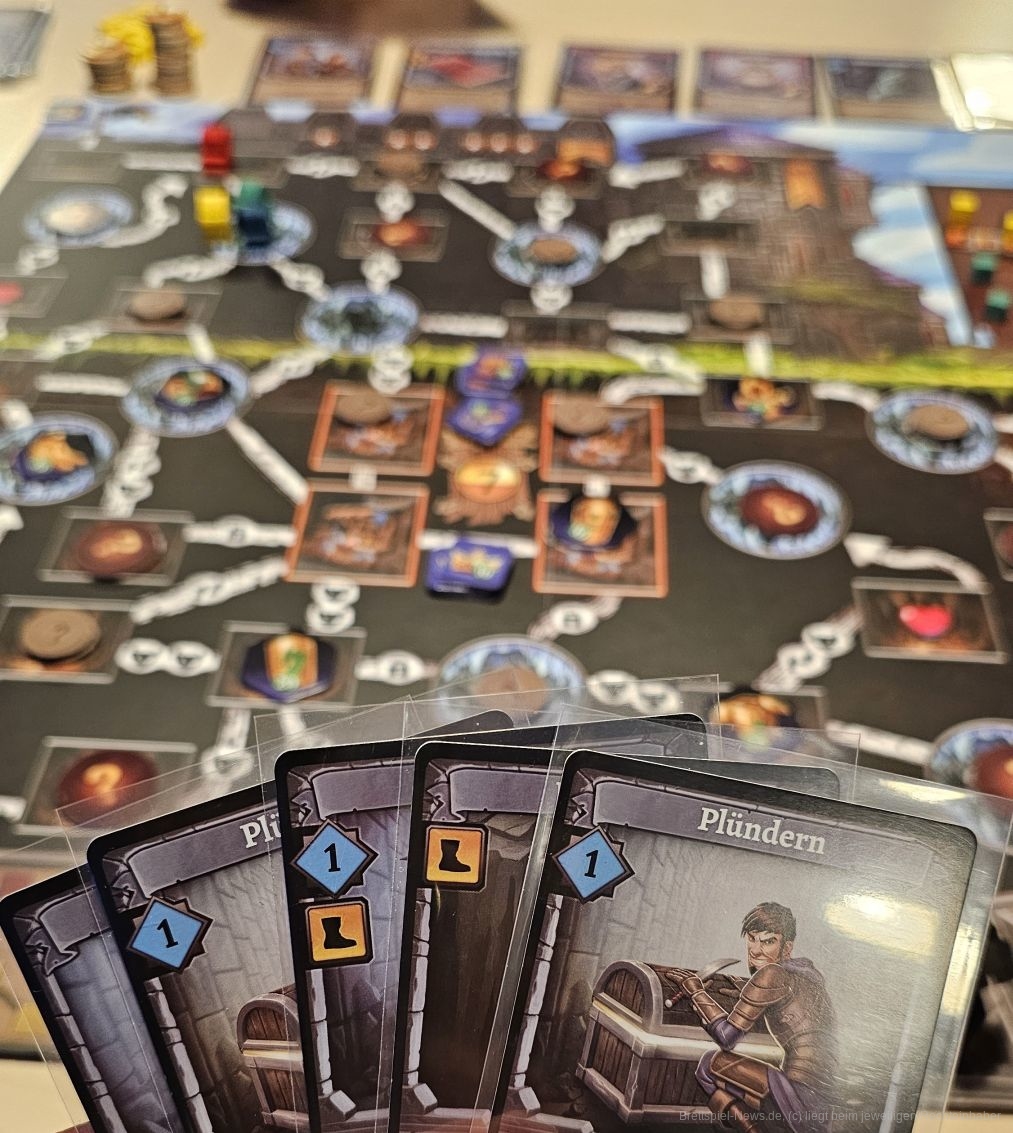 Karten erlauben es uns unseren Abenteurer zu bewegen, Monster zu bekämpfen oder eben neue Karten zu kaufen. Dabei sollten wir versuchen möglichst wenig Krach, also das titelgebende Klong! zu machen, denn wenn der Drache weiß, wo wir sind, erhalten wir Schaden, wenn er erwacht. In unserem Zug können wir unseren Abenteurer bewegen und Karten kaufen. Mit neuen Karten verbessern wir unser Deck, das im Grundspiel bei allen Personen zu Spielbeginn gleich ist und ehöhen so unseren Handlungsspielraum.