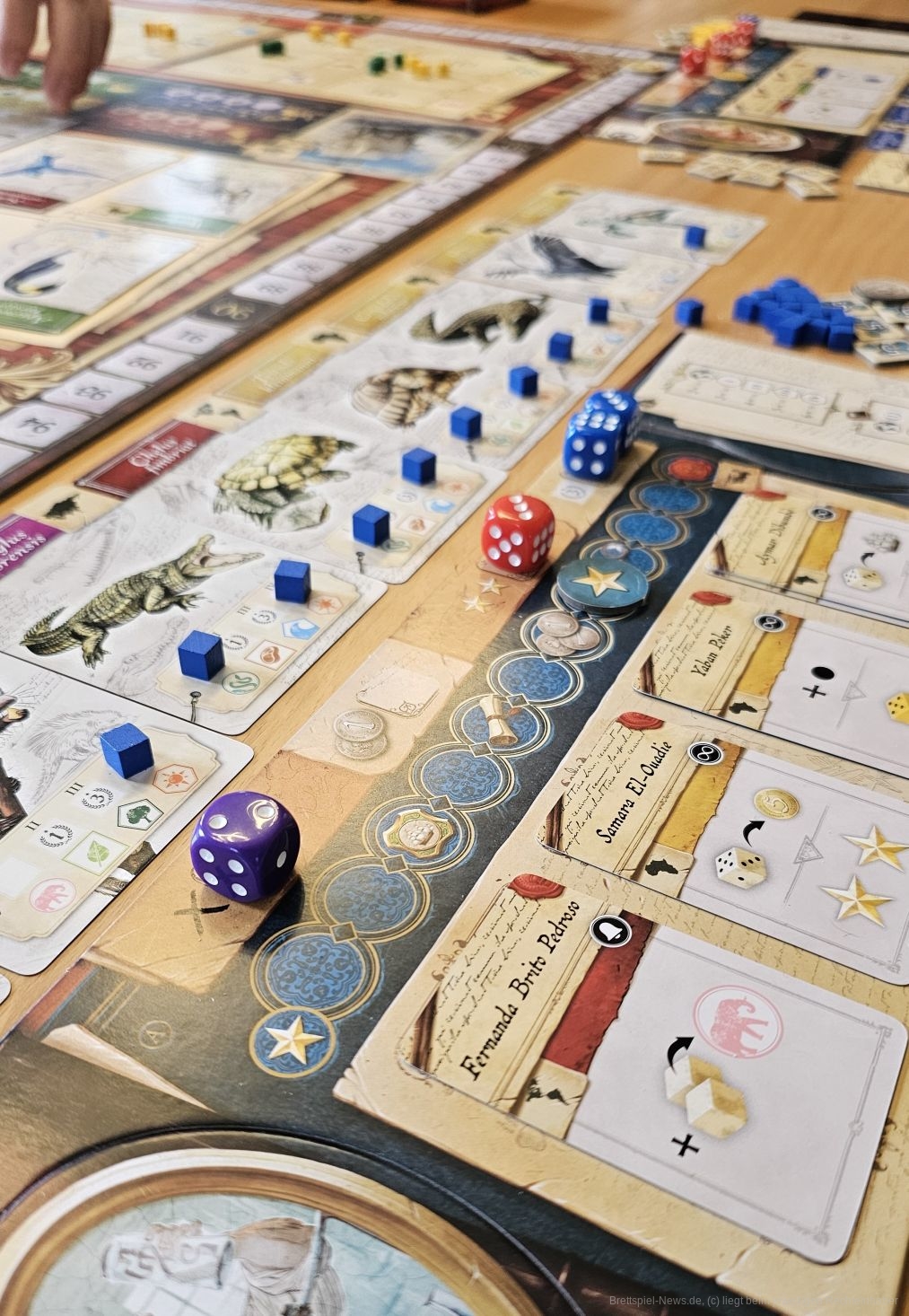 Zu Beginn einer Spielrunde ziehen wir 4 Würfel aus einem Beutel, werfen diese und platzieren Sie auf unserem Spieltableau. Alle Würfel stehen allen Personen zur Verfügung. Wählen wir einen Würfel einer anderen Person, erhält diese aber einen Bonus. Mit Geld und Expeditionstoken können wir den Wert und die Farbe unserer Würfel manipulieren. Die Würfel werden reihum eingesetzt. Wir können Geld erhalten, Tiere erforschen, unser Wissen veröffentlichen und vieles mehr.
