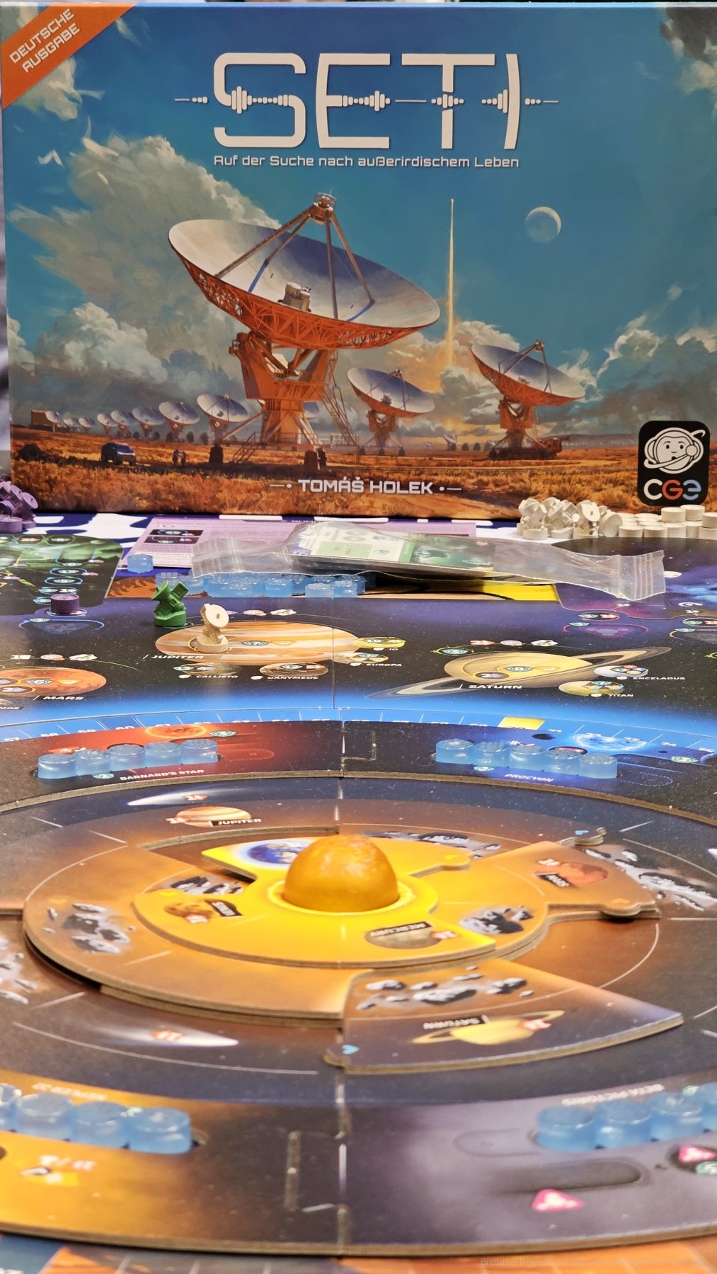 "SETI: Search for Extraterrestrial Intelligence" ist ein sehr thematisches, komplexes Expertenspiel für 1-4 Personen ab 14 Jahren mit einer Spielzeit von 60-160 Minuten, in dem wir versuchen, mit Credits, Energie und Multifunktionskarten am erfolgreichsten das All nach außerirdischem Leben zu erkunden.