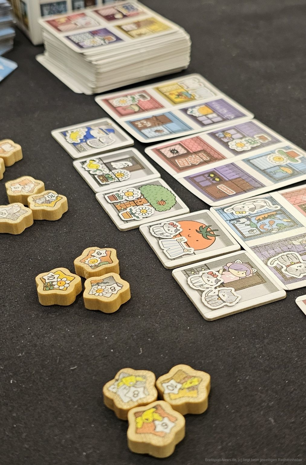 Legen wir die Karten so, dass mindestens 4 Räume in einer Farbe aneinandergrenzen und haben diese Räume eine "For Rent'"-Tür, dürfen wir eine Mieterin in Form von einem Plättchen aus der Auslage auf diese Tür legen. Mieter bringen Blumen, Katzen oder Vögel mit, die uns bei der Wertung Punkte bringen.