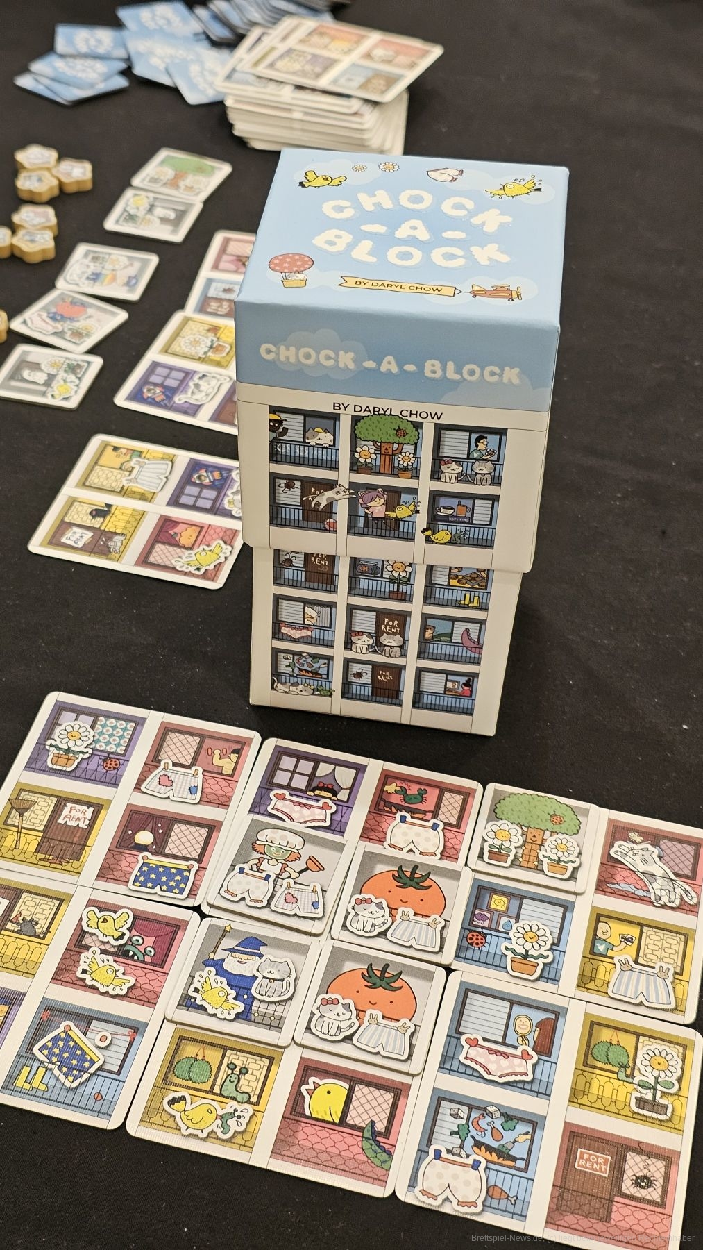 "Chock-A-Block" ist ein kleines, ultra süßes, aber keineswegs triviales Legespiel für 1-5 Personen ab 8 Jahren, in dem wir in 20-30 Minuten Handkarten ausspielen, um damit in einem Hochhaus ein punkteträchtiges Raster auszulegen.