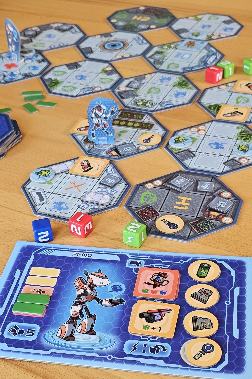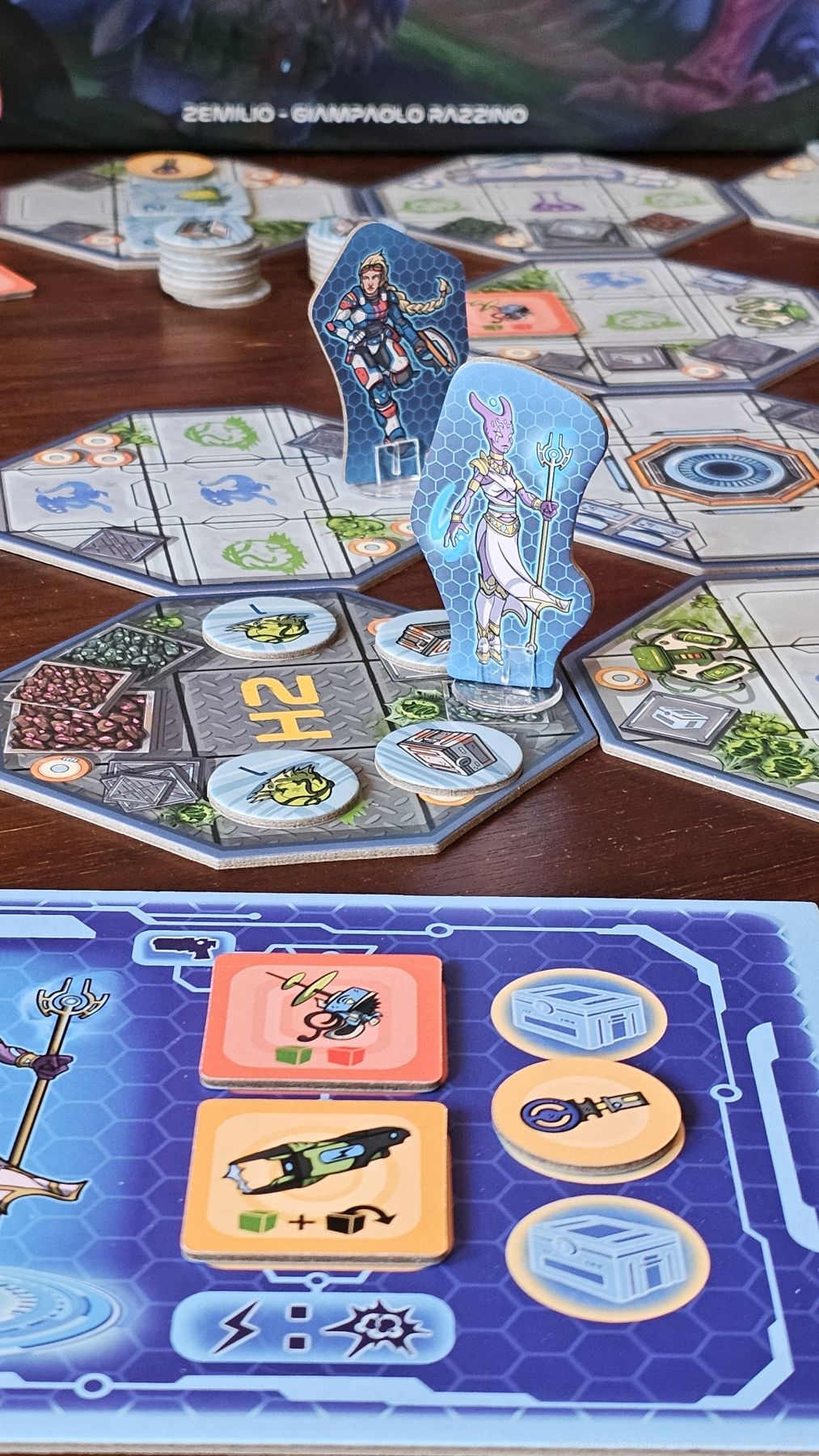 Werfen wir zum Beispiel eine Summe von 4, dürfen wir ein Alien mit dem Wert 2 und 2 Eier mit dem Wert 1 besiegen (umdrehen). Auf der Rückseite befindet sich Ausrüstung, die wir an uns nehmen können und uns besser macht. Besiegen wir ein Alien nicht, erhalten wir Schaden.
