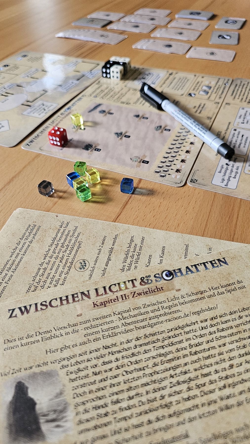 "Zwischen Licht und Schatten - Kapitel 2: Zwielicht" ist ein solo Ressourcenmanagement, Würfel-Manipulations- und Platzierungs-Spiel welches sich noch in der Entwicklung befindet, aber auf Messen schon Probe gespielt werden kann.