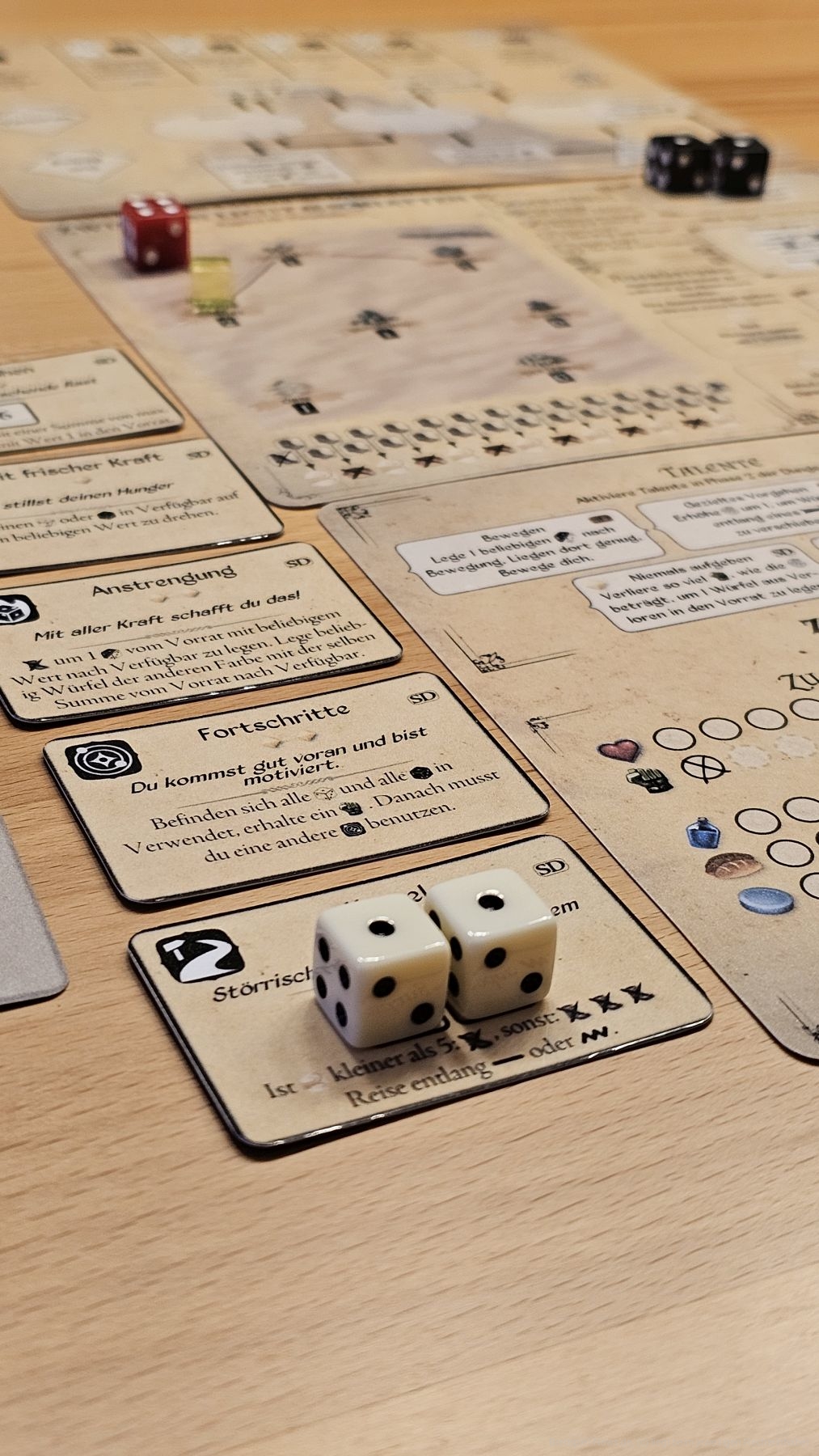 Auf der Messe Spiel 2024 in Essen durfte ich mir ein bereits gebasteltes Demo-Exemplar mitnehmen, um Feedback zu geben. Die erste Partie war anfangs aufgrund der Demo-Regeln etwas holprig, vor allem aber deswegen, weil das Spiel mit einigen Regeln bricht, die man als Vielspieler für selbstverständlich erachtet. So können Aktionskarten immer wieder genutzt werden und werden nicht abgelegt. Außerdem werden die Würfel nicht gewürfelt.