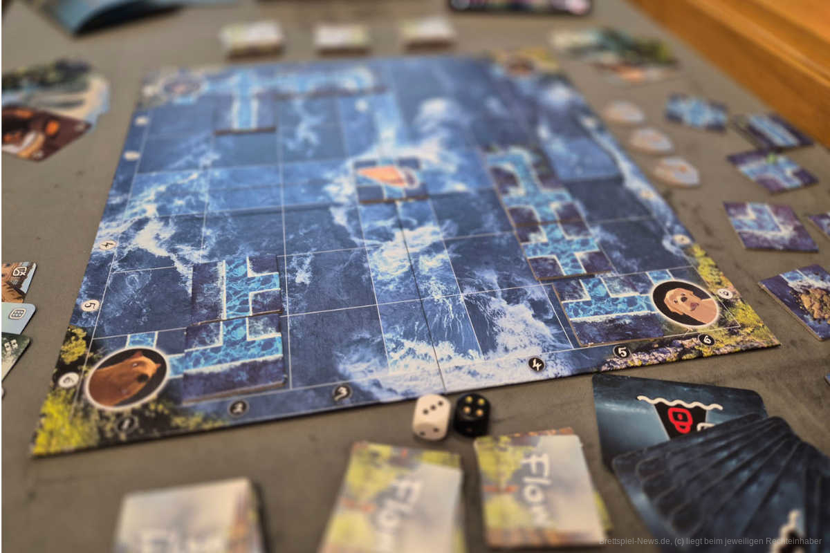 Flow ist ein kooperatives Familienspiel, im dem ein bis sechs Spielende versuchen der kleinen schwarzen Katze und ihren drei Freunden einen sicheren Weg zum rettenden Schiff zu bahnen und so vor der gefährlichen Überflutung zu retten. Die vier Tiere haben ihre Startpunkte in den Ecken des 7x7 Felder großen Spielfeldes, das rettende Schiff befindet sich in der Spielbrettmitte. Um den Tieren einen Weg auszulegen, ziehen die Spielenden reihum Plättchen und legen die Plättchen dann auf dem Spielfeld aus. Das Ganze geschieht während ein Timer eine Minute runterzählt. Ist der Timer ablaufen, kommt eine Welle und spült einiger der gelegten Plättchen vom Spielbrett. Welche Plättchen weggespült werden, wird durch das Würfeln zweier sechsseitiger Würfel ermittelt.