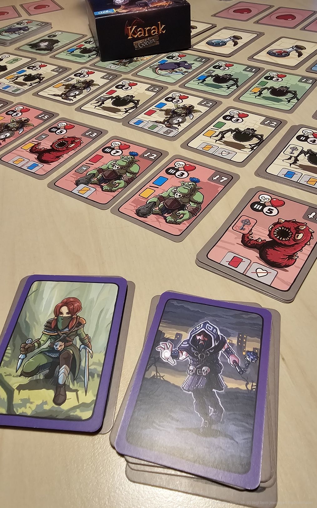 "Karak Goblin" ist ein kleiner Deck- und Engine-Builder für 2-4 Personen ab 8 Jahren mit einer Spielzeit von 30-90 Minuten, in dem wir versuchen, uns durch 3 Ebenen eines Dungeon zu schlagen, um zuerst den Endgegner zu besiegen.