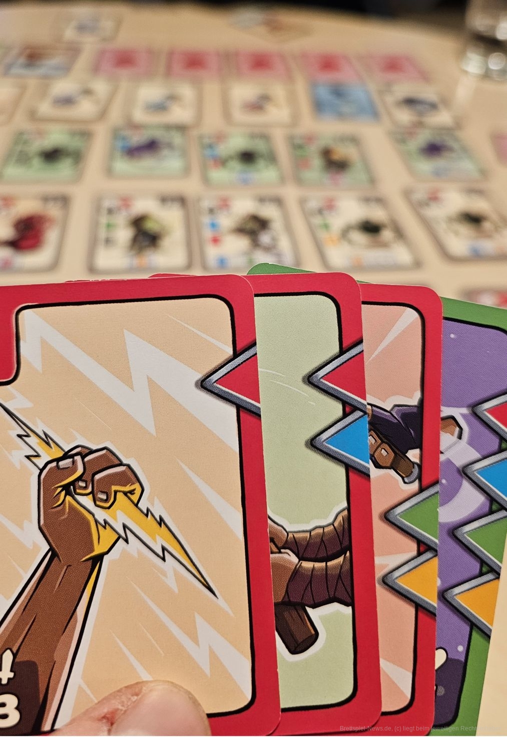 Sind wir am Zug, wählen wir einen Gegner und spielen dann zunächst eine Karte aus. Diese hat an ihrer rechten Seite eine Farbcodierung, welche uns erlaubt, weitere Karten der entsprechenden Farben auszuspielen. Haben wir die richtige Kombination gewählt, können so lange Kartenreihen entstehen. Auf den Karten steht dann unten ihr Effekt. Angriff, Verteidigung, Regeneration von Lebenspunkten oder Ziehen weiterer Karten.