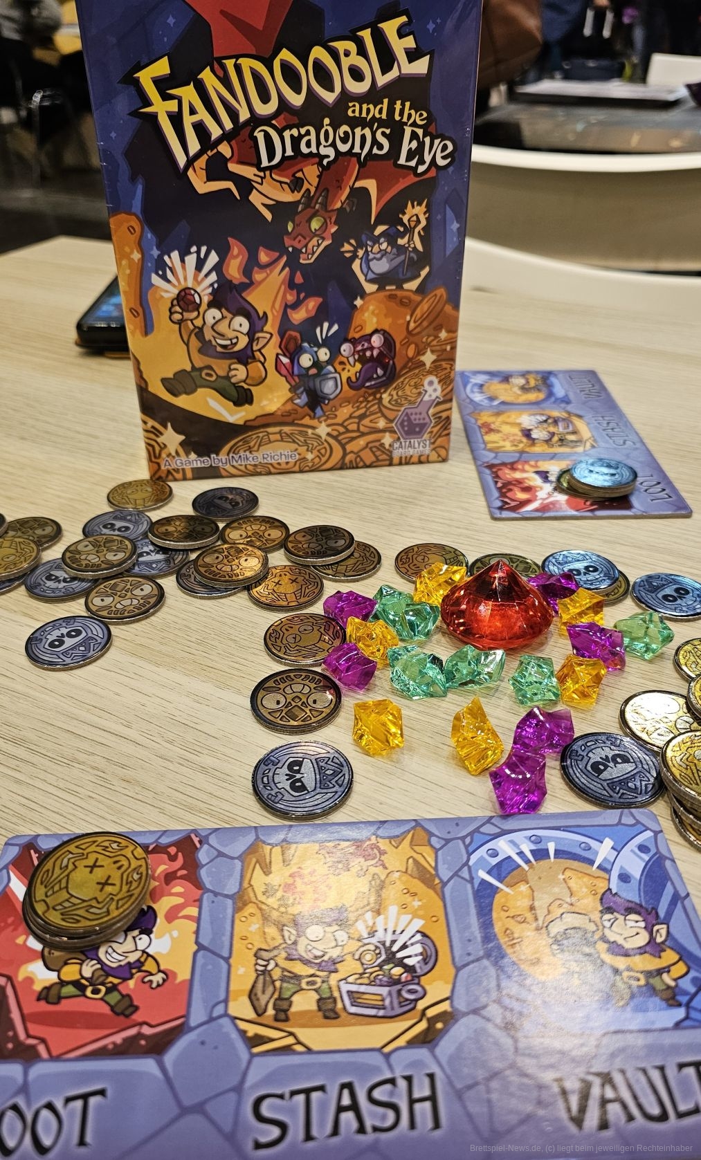 "Fandooble" ist ein einfaches Push-Your-Luck-Spiel mit toller Ausstattung für 2-6 Personen ab 8 Jahren, in dem wir in 20-30 Minuten kniffeltypisch unser Glück herausfordern und versuchen, so viel Gold und Edelsteine wie möglich abzustauben, bevor uns Drachen oder eben Fandooble unseren Reichtum wieder nehmen.