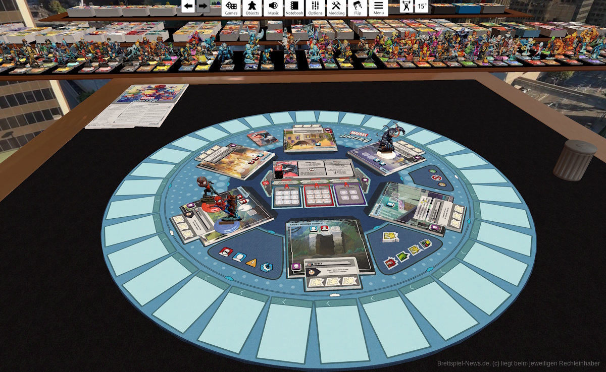 Beim Laden des Add-ons erschien eine Unmenge an Inhalten auf dem Spieltisch, ein Wizard half mir das Spiel zu konfigurieren. Schon war alles aufgebaut und der Schurke stand auf seinem Platz. Daneben lagen auch sämtliche Inhalte diverser Kickstarter-Editionen und zusätzlich auch einige, die von Fans erstellt wurden. Die Spieler holen sich ihren Helden samt Karten und können loslegen. Der Simulator macht keine Vorgaben was man mit dem Material macht, die Spielanleitung liegt allerdings auch auf dem Tisch.