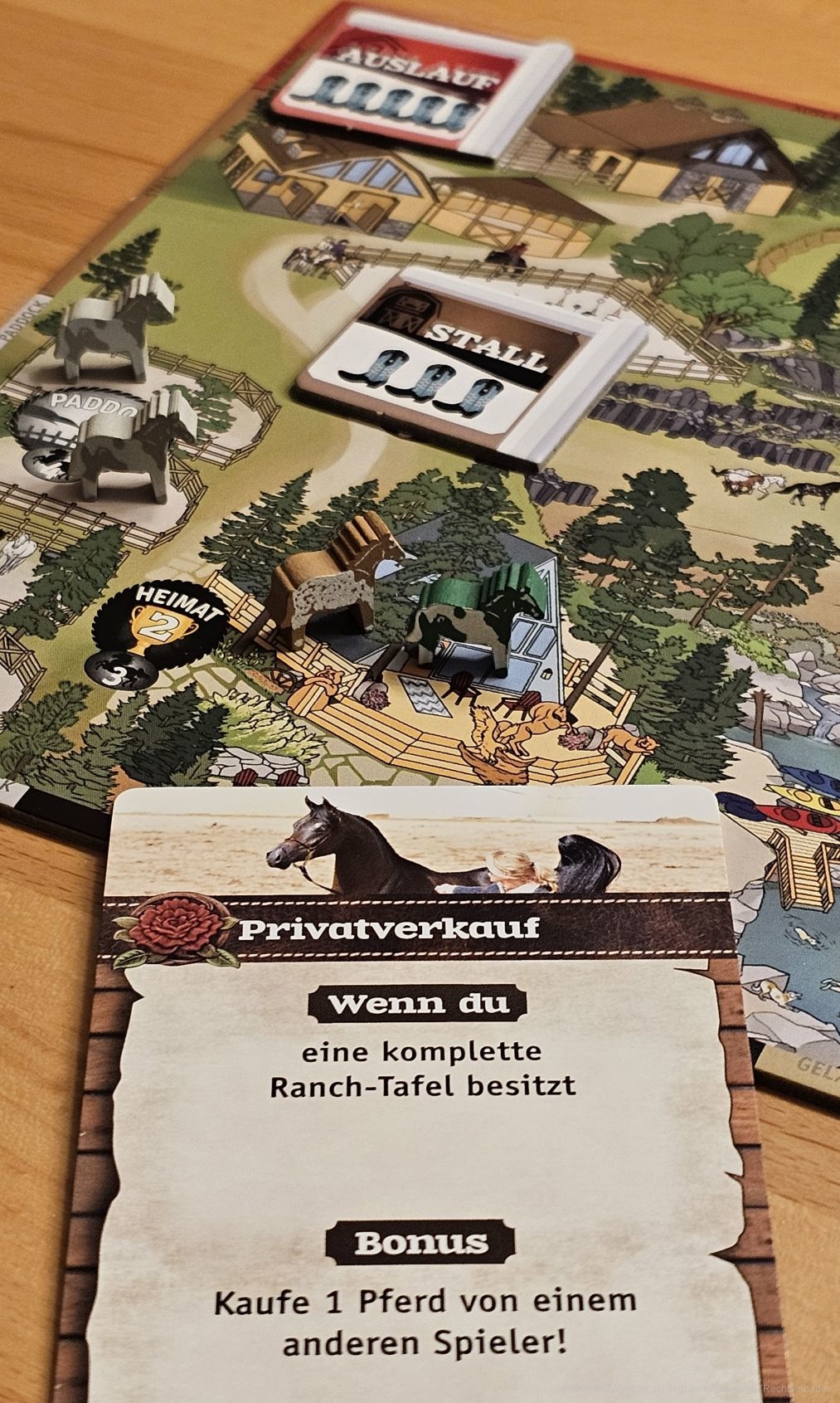 In jeder Runde erhalten wir eine Bonuskarte. Diese hat Voraussetzungen, welche uns Bonuszüge, zusätzliche Pferde oder Siegpunkte bescheren. Damit haben wir noch eine weitere Set-Collection-Ebene, welche wir bedienen können. Die Bonuskarten machen das Spiel deutlich komplexer.