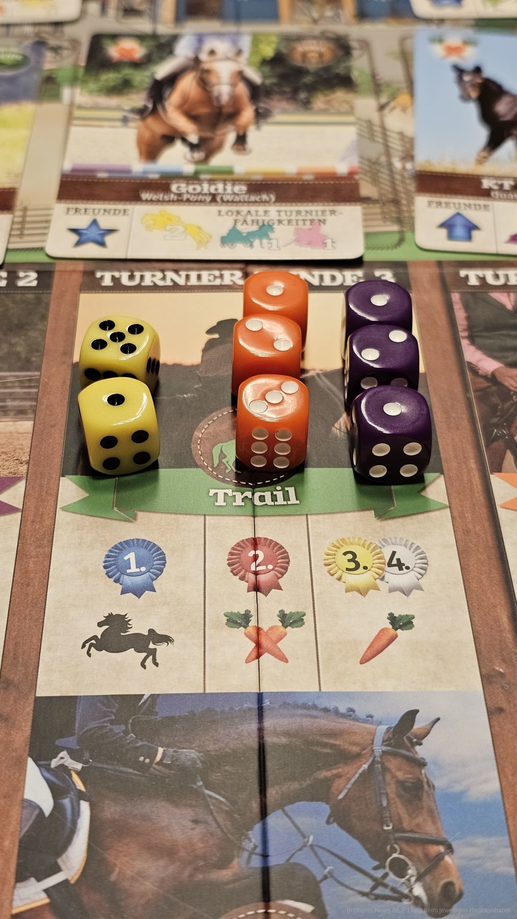 Pferde bringen allerdings jetzt nur noch Siegpunkte, wenn wir mindestens zwei oder drei Pferde mit gleichen Symbolen sammeln. Dies macht die Auswahl der Pferde schwieriger, denn nun müssen wir nicht nur darauf achten, an den verschiedenen Turnieren teilnehmen zu können, sondern auch unsere Sets vervollständigen.