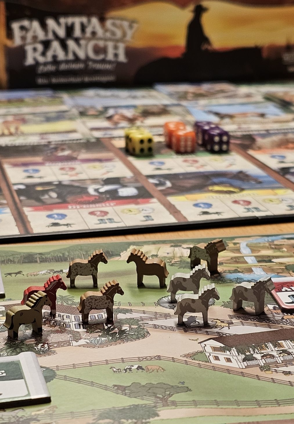 "Fantasy Ranch" ist im zweiten Level ein Würfel- , Set-Collection- und Ressourcen-Management-Spiel mit frischem Thema für 2-4 Personen ab 8 Jahren mit einer Spielzeit von etwa 60 Minuten, in dem wir versuchen, mit wenigen Aktionen unsere Ranch auszubauen, Bonuskarten zu triggern und Sets aus passenden Pferden zu erhalten.