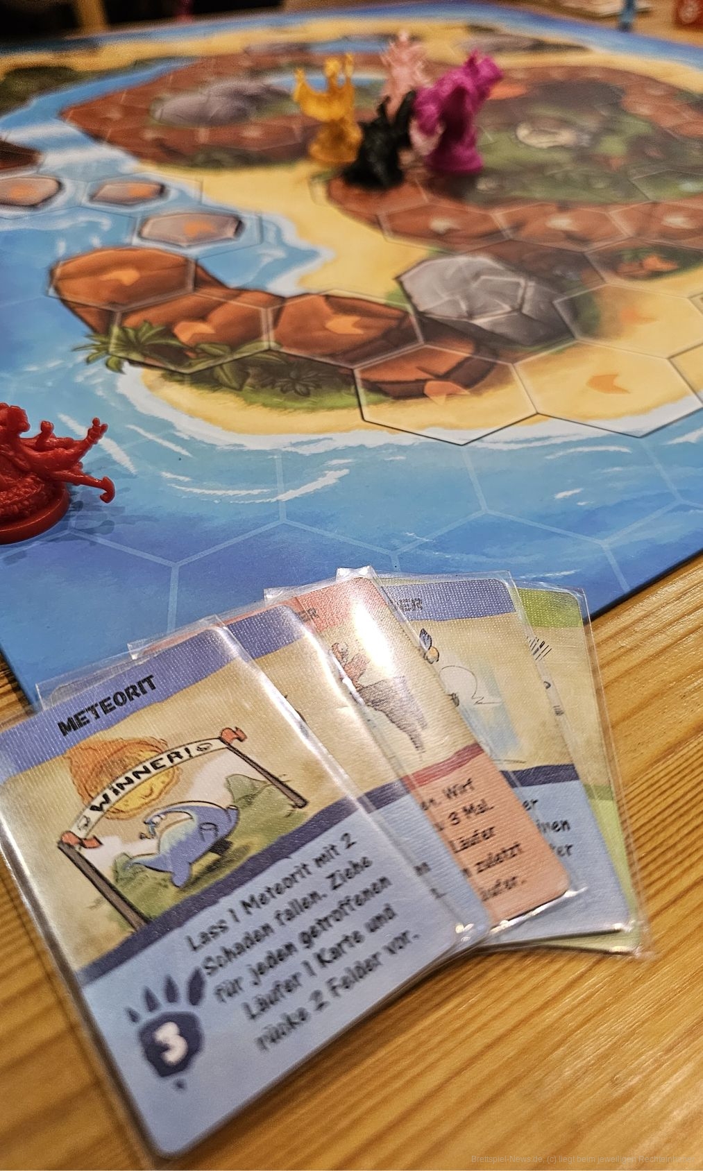 Dann werden alle Karten umgedreht und beginnend mit dem Startspieler abgehandelt. Rote Karten haben starke, gemeine Effekte. Haben mehrere Personen eine rote Karte aufgedeckt, entfallen deren Effekte. Blaue Karten werden immer ausgeführt und grüne sind Reaktionskarten, die Schutz bieten.