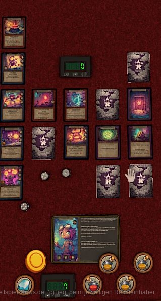 Was mir sofort aufgefallen ist, ist das kohärente Artwork des Spiels. Dies hat mir sehr gut gefallen, ist aber mit künstlicher Intelligenz und händischer Nachbearbeitung erstellt. Es ist wirklich interessant, wie gut es mittlerweile möglich ist, mithilfe digitaler Mittel eine wie aus einem Guss aussehende Welt zu erschaffen. Mich stört es nicht, vor allem weil Christian sofort offen mit dem Thema umgegangen ist. Das Spiel soll vielleicht noch neues Artwork von einem Künstler bekommen, das wird aber, denke ich, den Rahmen völlig sprengen, da 200 oder mehr Karten eine individuelle Illustration bekommen müssten. Ein kleines Ein-Personen-Projekt wie "Dungeon Dilemma" wird diese Kosten schwer erwirtschaften können. Ich persönlich finde den aktuellen Stil sehr ansprechend.