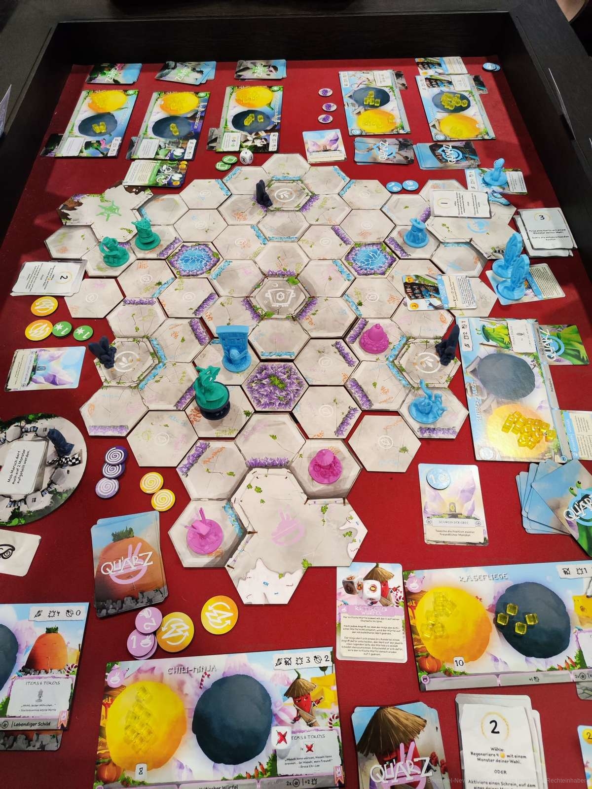 QU'ARZ war mein absolutes Highlight der Messe. Ich konnte es schon letztes Jahr auf der Spiel Doch! In Dortmund spielen und war damals schon total begeistert. Nicht nur das mega geile und lustig/kreative Design der Monster, wie z.B. eine Käsefliege, ein Bücherwurm oder der Basketballelefant fallen direkt ins Auge, auch die Art des Spiels. Man überlegt direkt ob man nicht andere „Capture the Flag“ Brettspiele kennt, aber zumindest mir sind keine eingefallen.