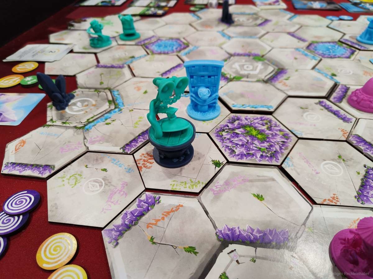 Auf dem Spielfeld ist immer sehr viel Dynamik. Die eigenen zwei Aktionen, die man pro Runde zur Verfügung hat müssen wohl überlegt sein. So kommt es vor, dass pro Runde mehrmals die Kontrolle über den Kristall wechseln kann, obwohl man sich doch so sicher war. Am 1. April startet die Gamefound-Kampagne zu diesem Spiel. Eins ist sicher, Ich bin sowas von drin in der Kampagne, denn ich hatte schon lange nicht mehr soviel Spaß mit einem Game.