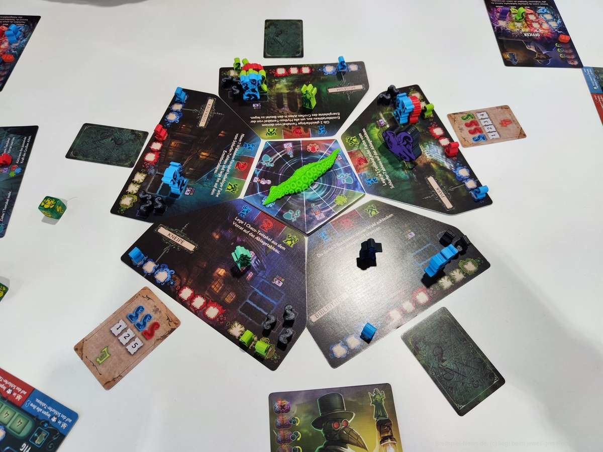 Als erstes überrascht die Tiny Epic Reihe bei diesem Titel wieder mit der Menge an Inhalt in dieser kleinen Box. Besonders auch die Materialqualität ist auf hohem Niveau. Bedruckte Holzmeeple, ein Stoffsack und ein Spinner in Tentakelform machen einen sehr guten Eindruck. Negativ fällt zu Beginn direkt der Spielaufbau auf, der sehr kleinteilig und zeitaufwendig ist. Der Spielverlauf wirkt sehr repetitiv und glückslastig. Zu wenig Einfluss können wir auf die Würfelergebnisse nehmen und müssen uns mit einem unbefriedigten Zug begnügen.