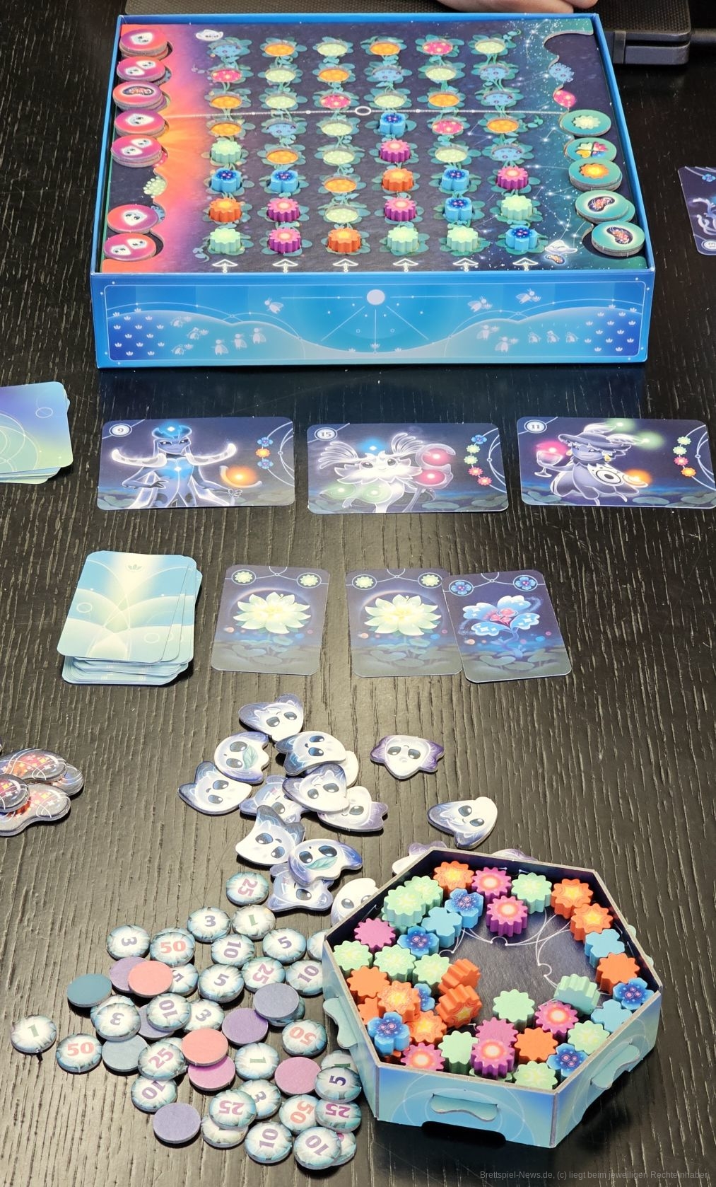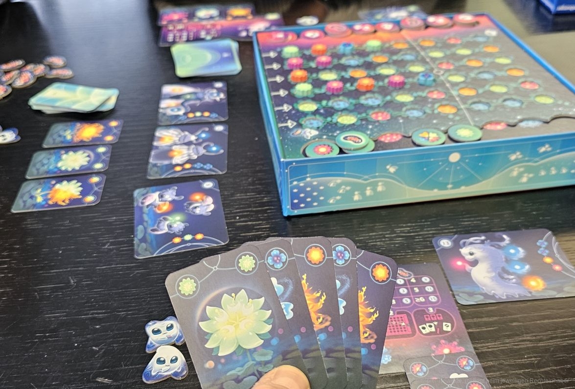 Eine Art von Boni sind Auftragskarten, die besonders viele Siegpunkte bringen. Allerdings müssen wir die Aufträge vollständig erfüllen, sonst gibt es nichts. Dann können wir noch Sternenstaub sammeln, der uns viele Punkte gibt, wenn wir viel davon haben. Und Geister, die uns mehr Karten ausspielen oder ziehen lassen.