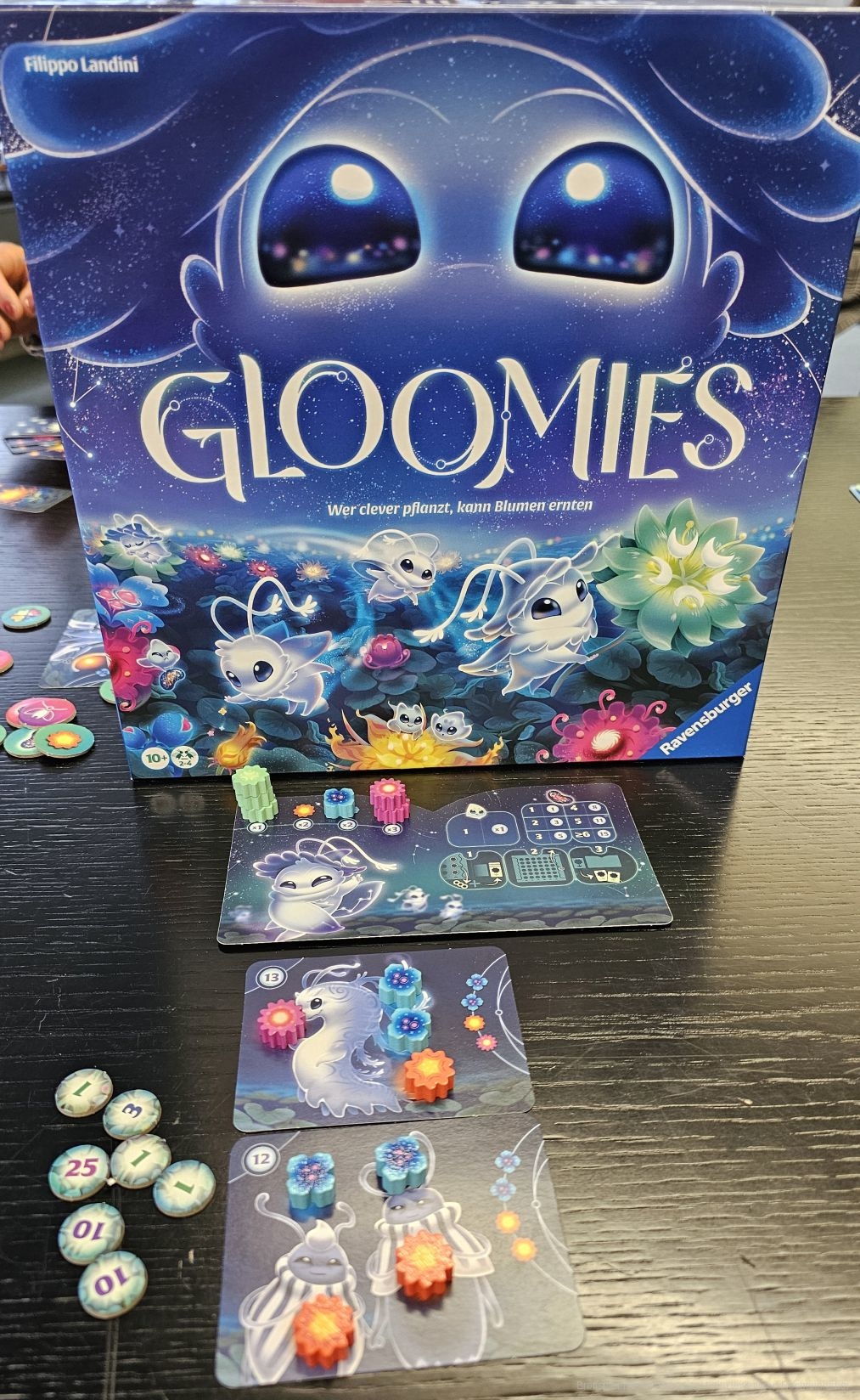 "Gloomies" ist ein Set-Collection-Spiel mit Deckbau-Elementen für 2-4 Personen ab 8 Jahren mit einer Spielzeit von etwa 30 Minuten, in dem wir mit Hilfe von knuffigen Geistern zunächst Blumen pflanzen und sie in einer zweiten Spielphase wieder ernten, um Aufträge damit zu erfüllen.