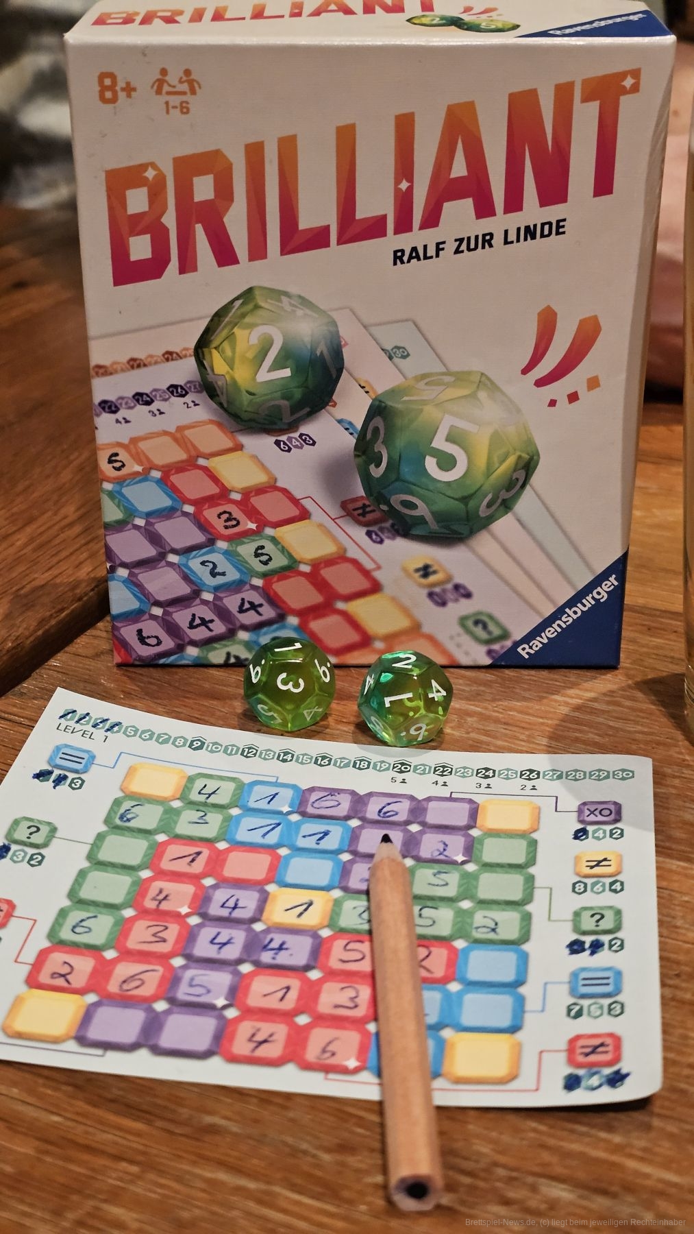 "Brilliant" ist ein simples Roll and Write-Spiel für 1-6 Personen ab 6 Jahren mit einer Spielzeit von ungefähr 15 Minuten, bei dem wir Zahlen nebeneinander eintragen, um Gebiete zuerst zu füllen.