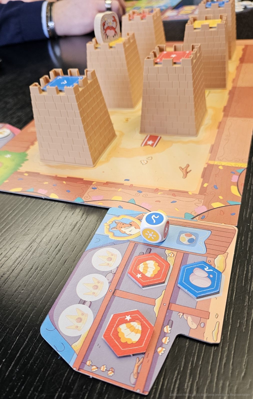Königin Krabbe kommt zu Besuch und wir müssen unsere Häuser schmücken. Dazu werfen wir je zwei Würfel und können diese dazu einsetzen, um entweder unter eine der schönen großen Sandburgen zu gucken und eine der darunter befindlichen Ressourcen auf unsere Schubkarre zu legen oder eben diese Schubkarre geräuschvoll zu unserem Spielplan zu fahren, um dort Häuser zu schmücken oder permanente Fähigkeiten frei zu schalten.
