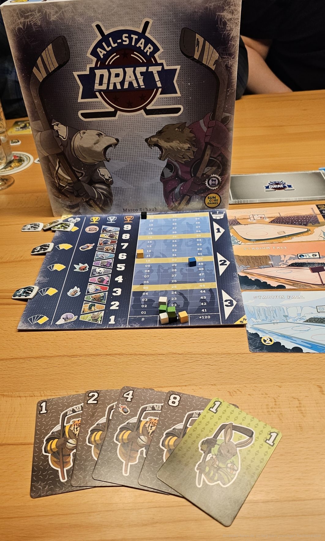 Während des Drafts sollten wir darauf achten, Sets zu bilden. Die Karten zeigen Symbole, Tiere und Zahlen. Aus diesen 3 Attributen können wir Sets bilden. So bilden 4 Eisbären ein 4er-Set. Je mehr Karten unser Set hat, desto höher sind unsere Gewinnchancen im Spiel. Haben mehrere Personen Sets in der gleichen Anzahl, werden im Spiel zu fünft erst die Symbole, dann die Tiere und danach erst die Zahlen gewertet. Die Punktetafel hilft übersichtlich bei der Auswertung.