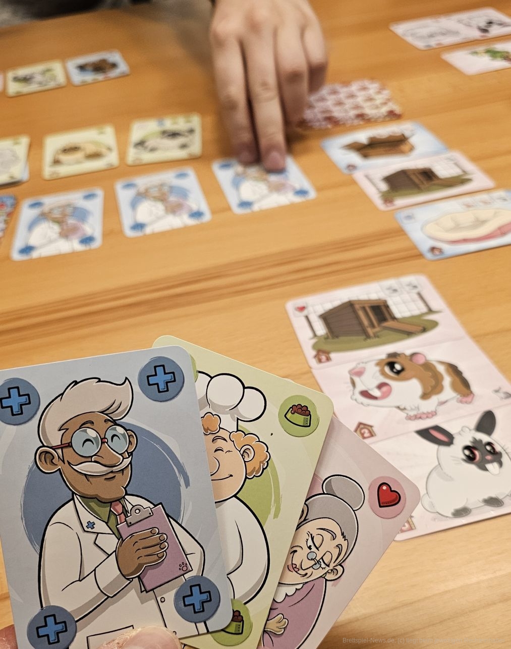 Sind wir am Zug, dürfen wir uns aus der Auslage 2 Karten nehmen. Die Auslage besteht aus Tieren und Karten, die unsere Tiere wieder glücklich machen. Nachdem wir Karten genommen haben, dürfen wir so viele Karten ausspielen, wie wir wollen. Tiere haben dabei manchmal noch Bonuseffekte, die uns weitere Karten ziehen lassen.