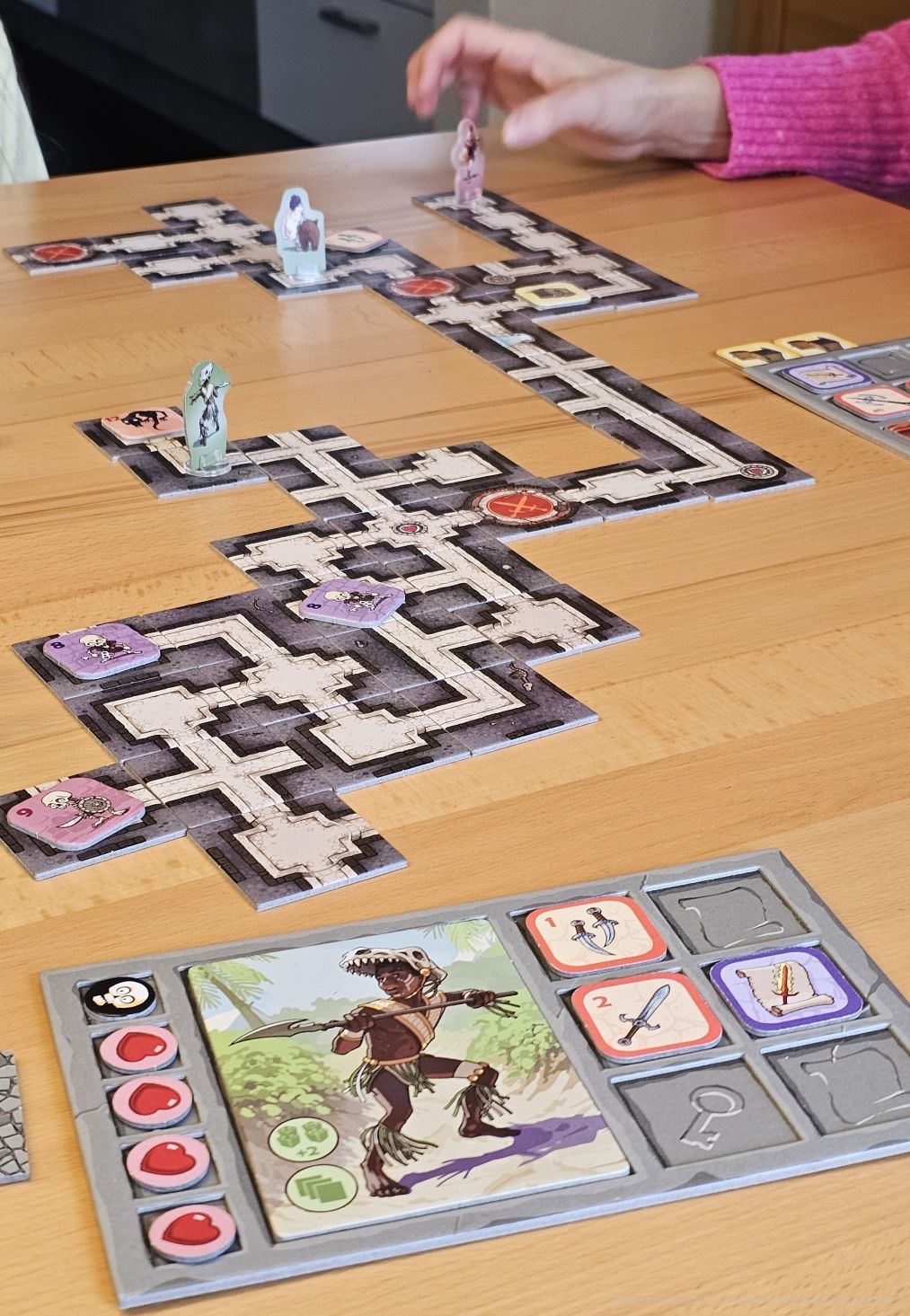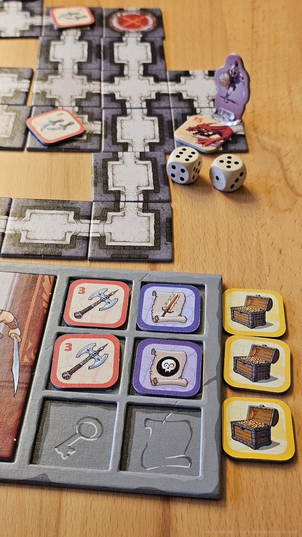 "Karak" ist ein einfacher Dungeoncrawler für 2-5 Personen ab 5 Jahren mit einer Spielzeit von 30-45 Minuten, in dem wir uns aufrüsten, Monster bekämpfen und versuchen, im Wettkampf gegeneinander die meisten Schätze zu erlangen.