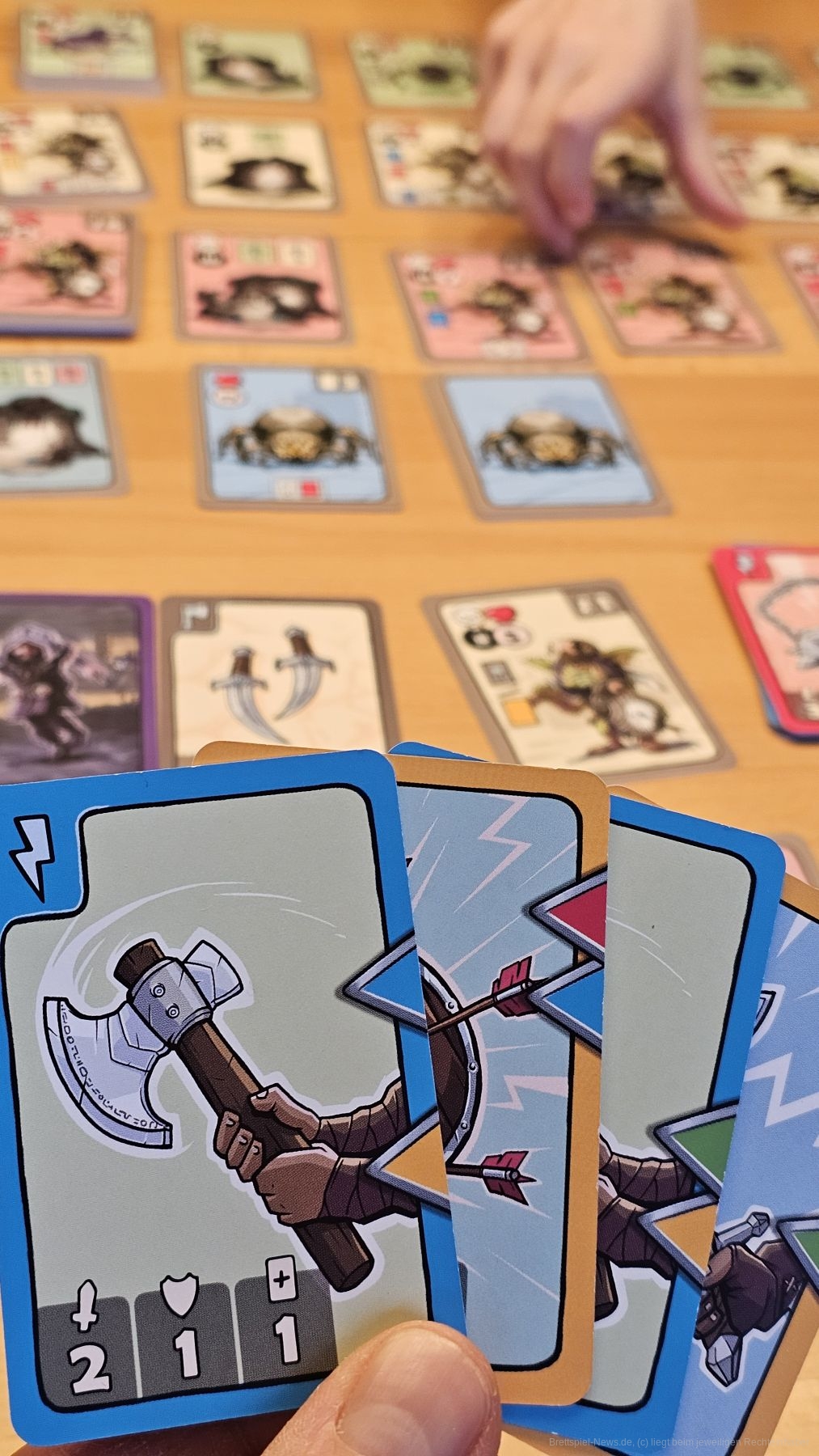 Zu Beginn zieht eine Person entsprechend der Anzahl an Personen, die am Spiel teilnehmen, Monsterkarten. Davon sucht sie sich ein Monster aus, gegen das sie kämpfen will und gibt die restlichen Monster weiter. Haben alle ein Monster, kämpfen wir gleichzeitig gegen unsere Monster. So entsteht keine Downtime und das Spiel hat einen netten Flow.