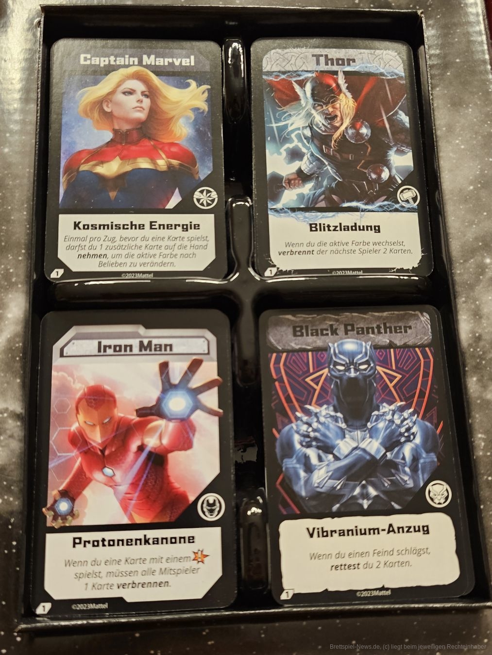 Die schwarzen Sonderkarten haben zu ihrer normalen Funktion auch noch zusätzliche Effekte. So kann sich Black Panther zum Beispiel besonders gut heilen, also vorher ausgespielte Karten wieder in seinen Zugstapel mischen.