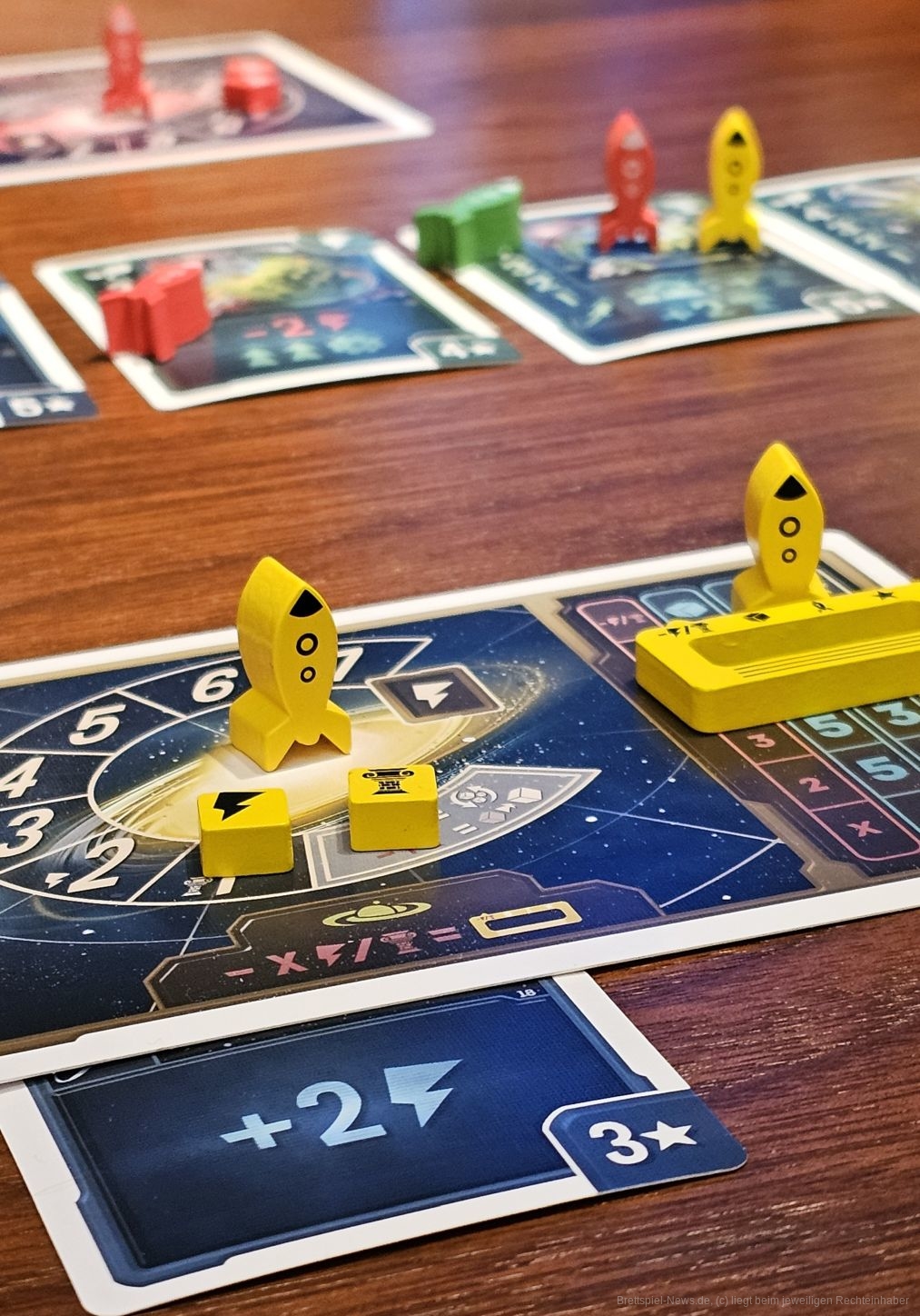 Mit unseren Raketen können wir auf Planeten landen, um dessen Aktion zu triggern oder ihn umrunden, um ihn zu kolonialisieren. Dazu benötigen wir Ressourcen, die wir erwürfeln können. Es gibt aber auch die Möglichkeit, durch Planetenaktionen die Kolonisierung voranzutreiben. Kolonialisierte Planeten nehmen wir in unsere Galaxis auf und haben dann alleinigen Zugriff auf deren Aktion.