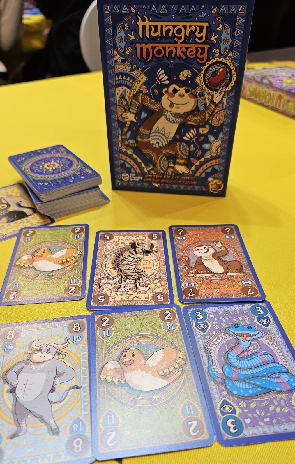 "Hungry Monkey" ist ein interessantes Hand-Management-Kartenspiel mit Kniff für 2-6 Personen ab 8 Jahren mit einer Spieldauer von 15-30 Minuten, in dem wir offene Handkarten und drei verdeckte Karten vor uns ausliegen haben. Ziel des Spiels ist es, alle Karten loszuwerden, um die Spielrunde zu gewinnen.