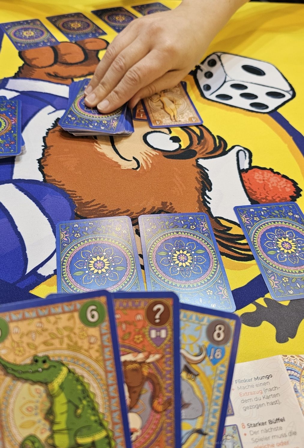 Sind wir am Zug, können wir eine oder mehrere gleiche Karten spielen. Diese haben Zahlen und Effekte. Gespielte Karten müssen im Normalfall höher oder gleichwertig sein als die letzte gespielte Karte. Die Effekte lassen uns zum Beispiel unter unsere verdeckten Karten schauen oder Handkarten mit den Karten vor uns tauschen. So wissen wir nach einigen Aktionen, welche Karten vor uns liegen.