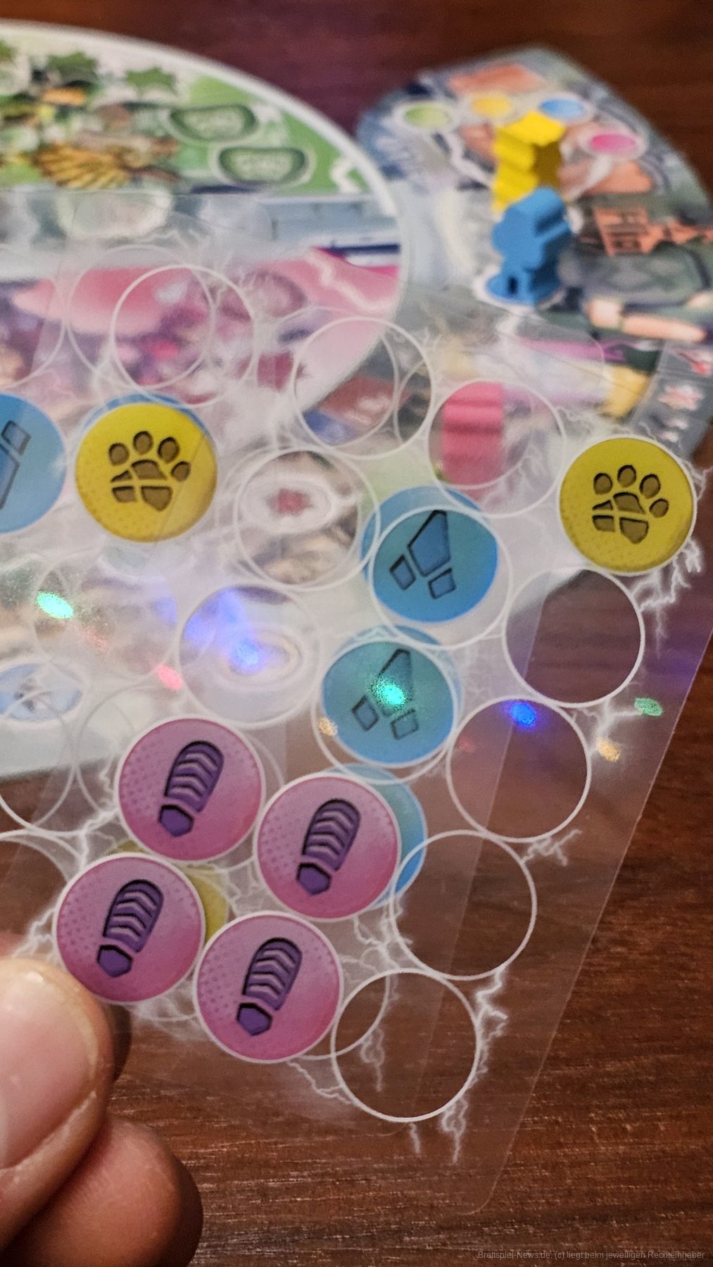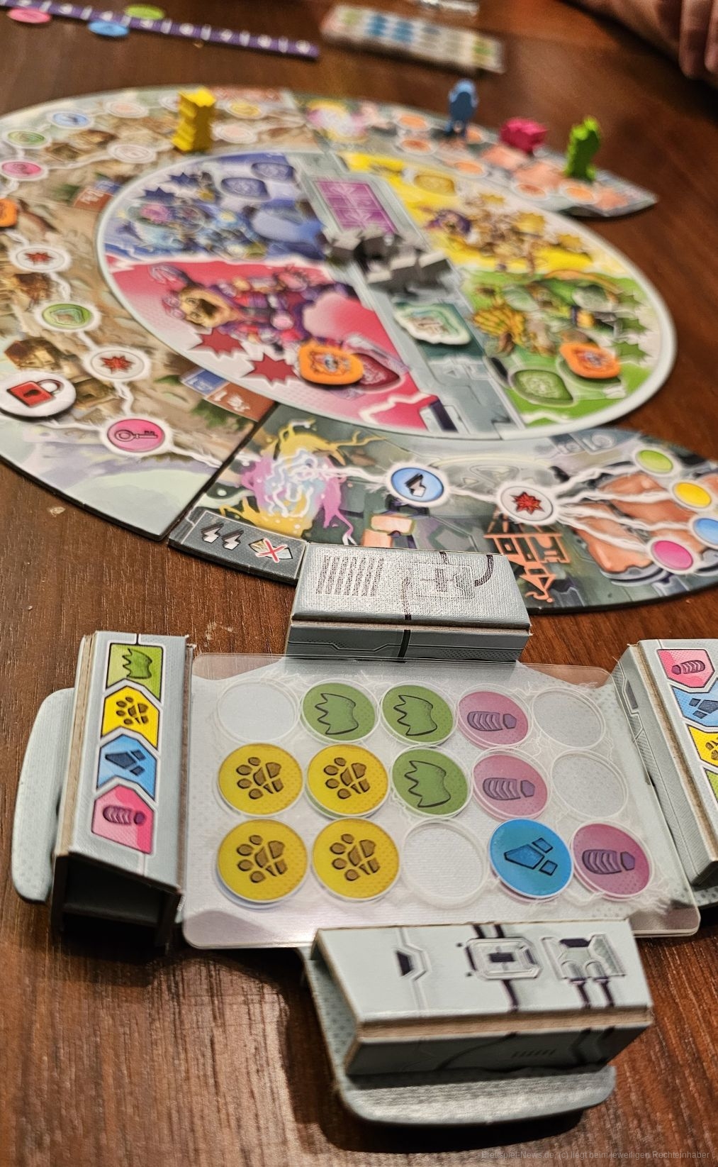 Wir dürfen, bevor der Timer startet, nur grob über unsere Handkarten sprechen, die Symbole in verschiedenen Farben zeigen. Zum Beispiel dürfen wir sagen: Ich habe viel blau und kaum grün.