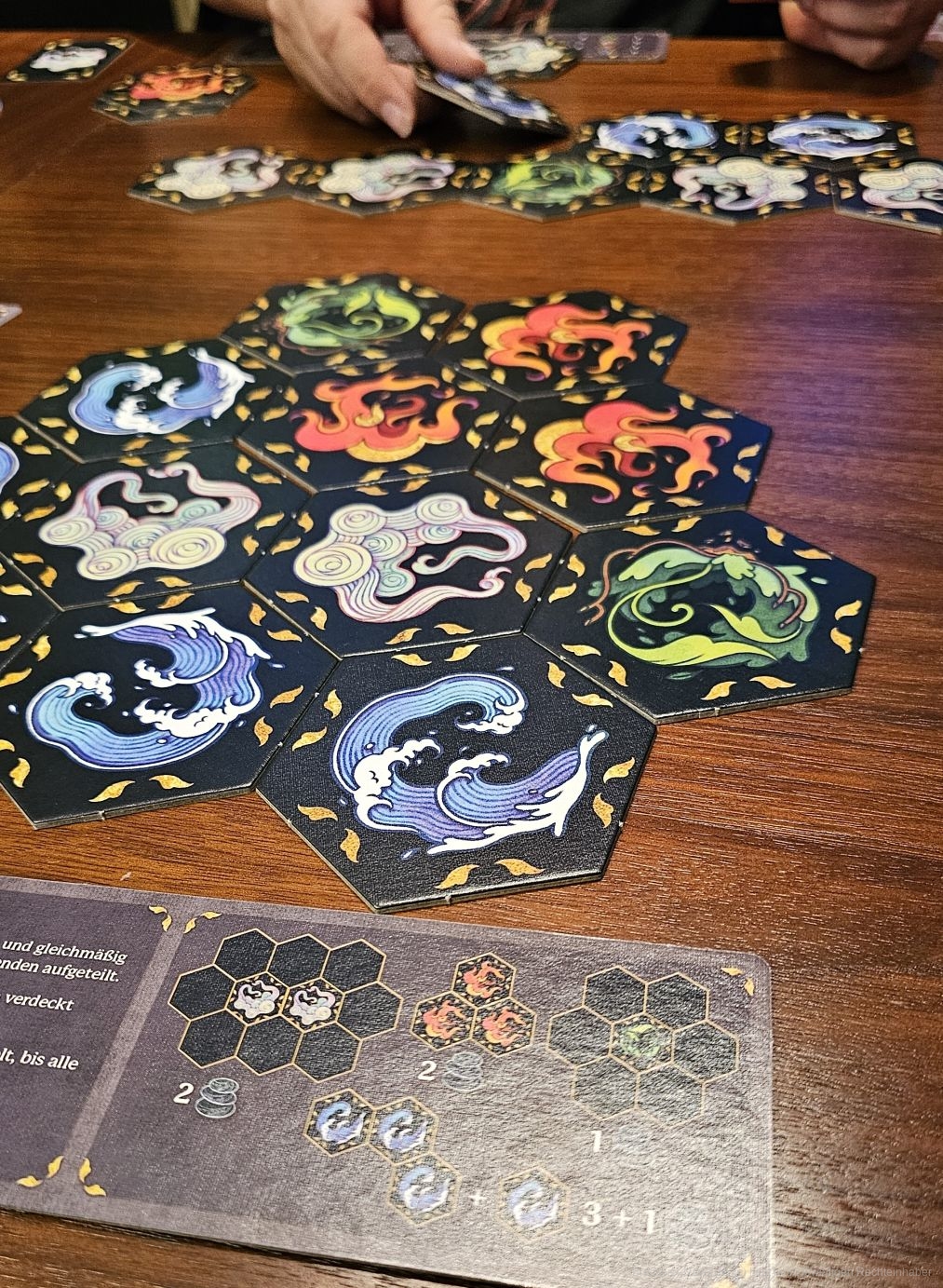Zu Spielbeginn wählen wir eines der vier Elemente: Feuer, Wasser, Luft oder Erde. Diese Elemente bestimmen unter anderem, welche Plättchen wir anfangs erhalten. Dann werden Plättchen auf die Hand genommen und gedraftet. Hier sollten wir die Plättchen so wählen, dass wir mit ihnen werten können. Die Elemente bringen später Siegpunkte, wenn sie auf gewisse Weise angeordnet werden. Nach dem Draft legen wir die Plättchen in einem beliebigen Muster vor uns aus. Eine Übersichtskarte hilft dabei, sie sinnvoll zu platzieren.