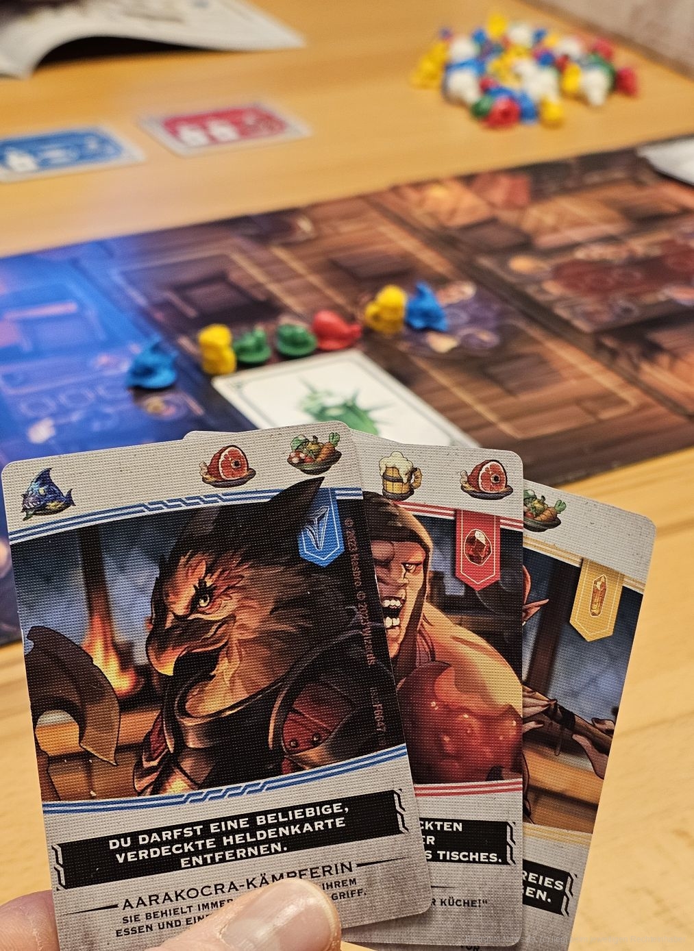Helden haben Bedürfnisse. Auf dem Kopf der Karte ist angezeigt, was sie wollen. Platzieren wir einen Helden, werden seine Bedürfnisse mit den Speisen vor ihm verglichen. Für jede passende Speise belohnt er uns mit einem Edelstein in passender Farbe. Diese Edelsteine ergeben nachher die Siegpunkte.