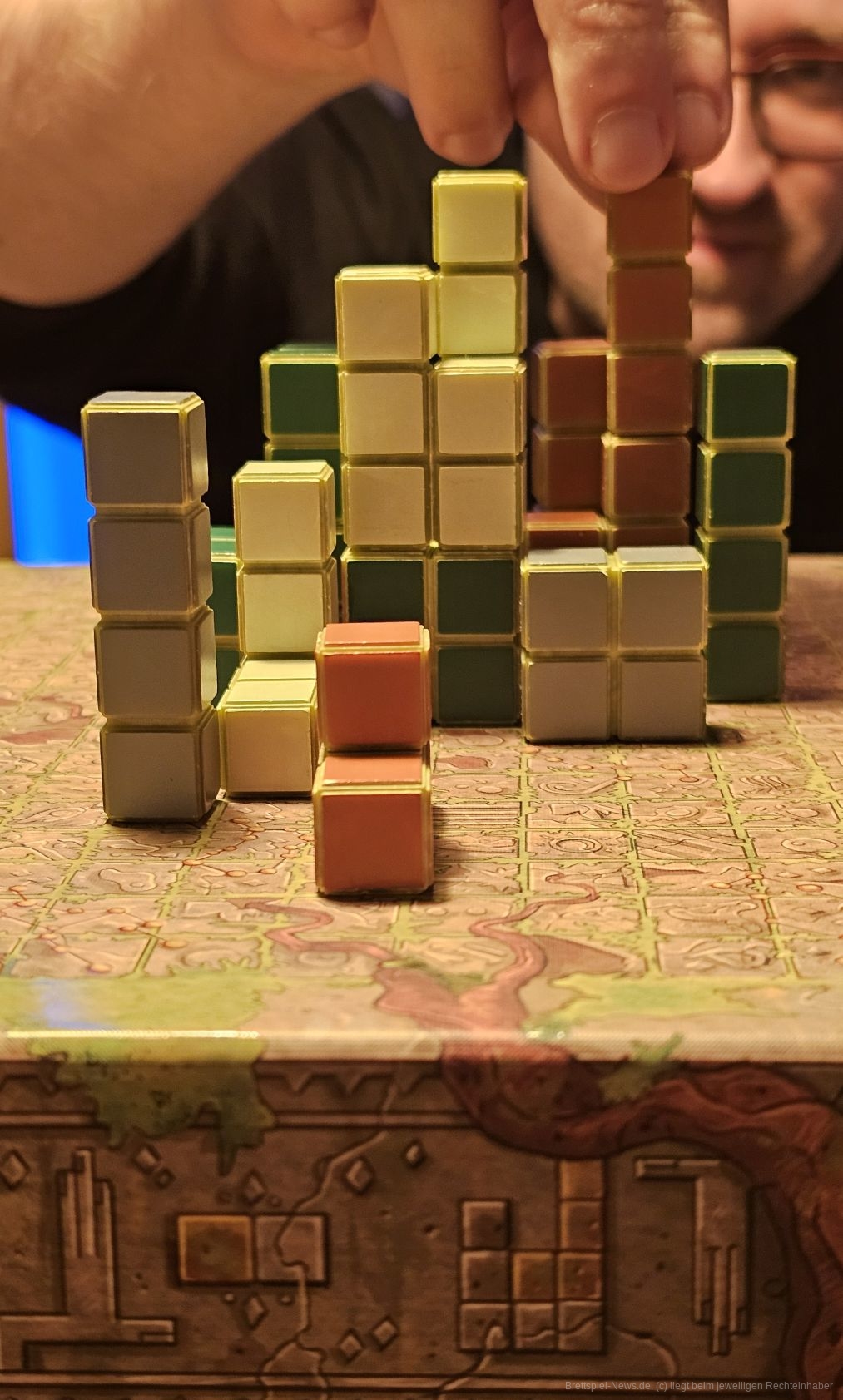 Schon der Aufbau macht das Spiel besonders. Aus der Schachtel wird ein hoher Aufbau gebaut, der uns das Spielgeschehen auf eine angenehmere Höhe hebt. Denn es ist wichtig, dass wir genau senkrecht auf eine Seite blicken, am besten auf Augenhöhe.